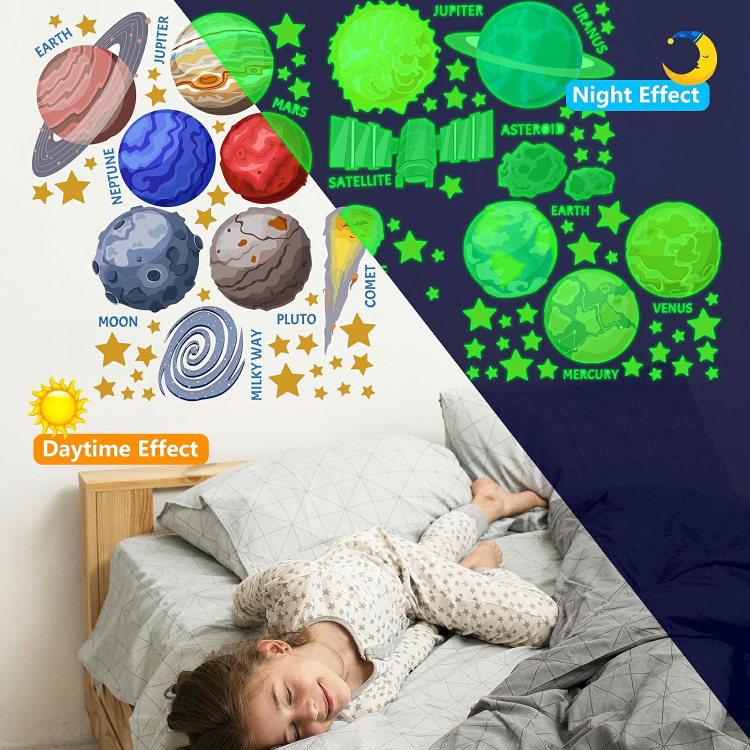 - โฆ DIY Wall Decals: You will get 4 sheets (Size of each sheet: 11.8 x 8.26 inch) of glowing cosmic planets wall decals in a set, including Earth,Moon, Pluto, Comet, Mars, Jupiter, Venus, Mercury, Uranus, Asteroid, Neptune, Satellite, Milky Way. Super bright luminous wall stickers to turn your kid's room into a vivid and realistic cosmic galaxy world, can be combined arbitrarily to create your own starry sky.
