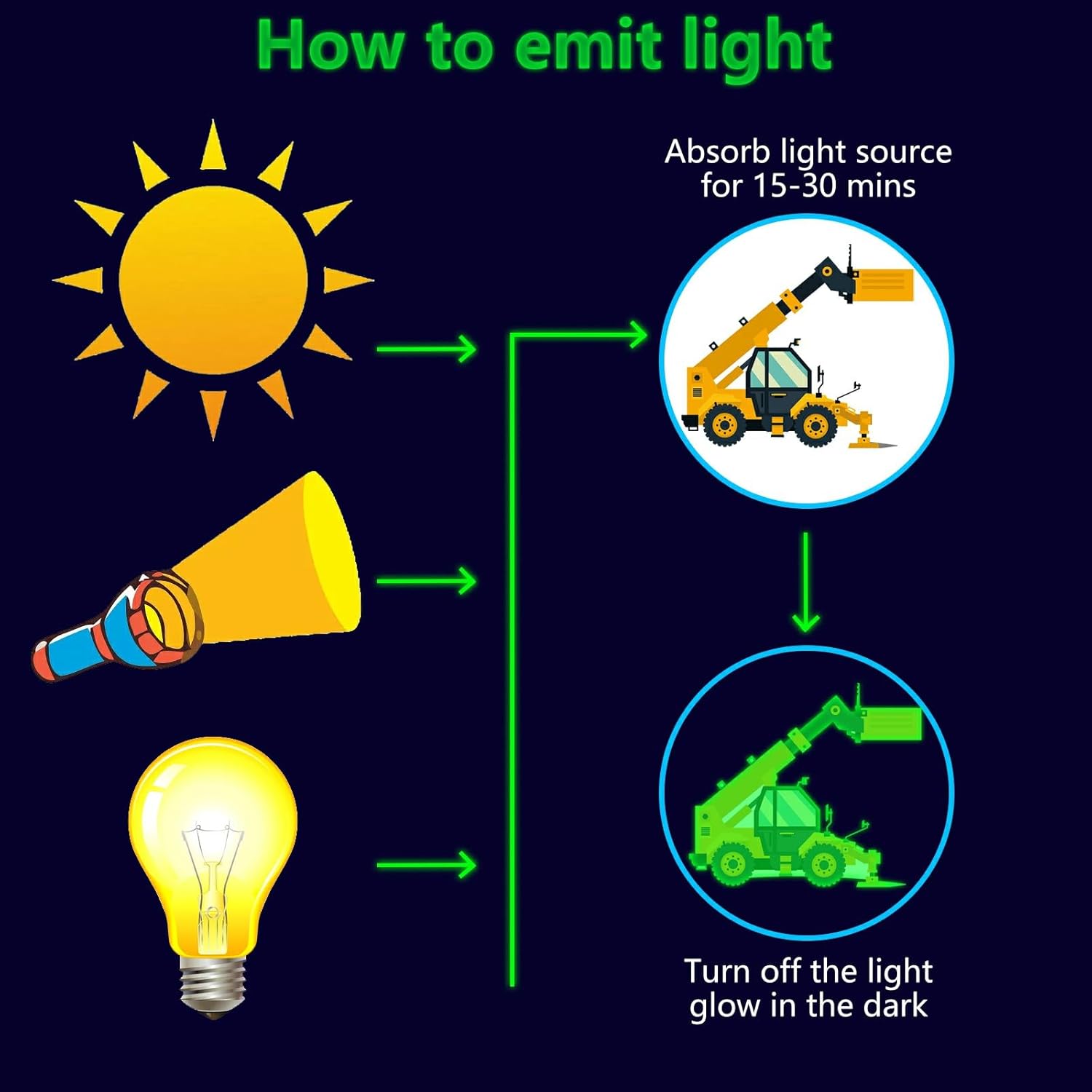 - โฆ Glow Construction Wall Decals: These glow wall decals for ceiling are made of quality luminous material,they will glow brightly when absorb enough light during the day. You just need to put it under lamplight flashlight ,room light or sunshine for 15 minutes, it will keep glowing for 8-10 hours with a gentle green fluorescent light. Please ensure the light shines on the decals without obstruction, the longer it takes to absorb light, then to light up for up to longer.
