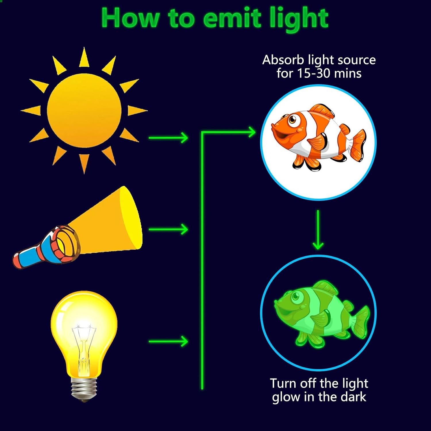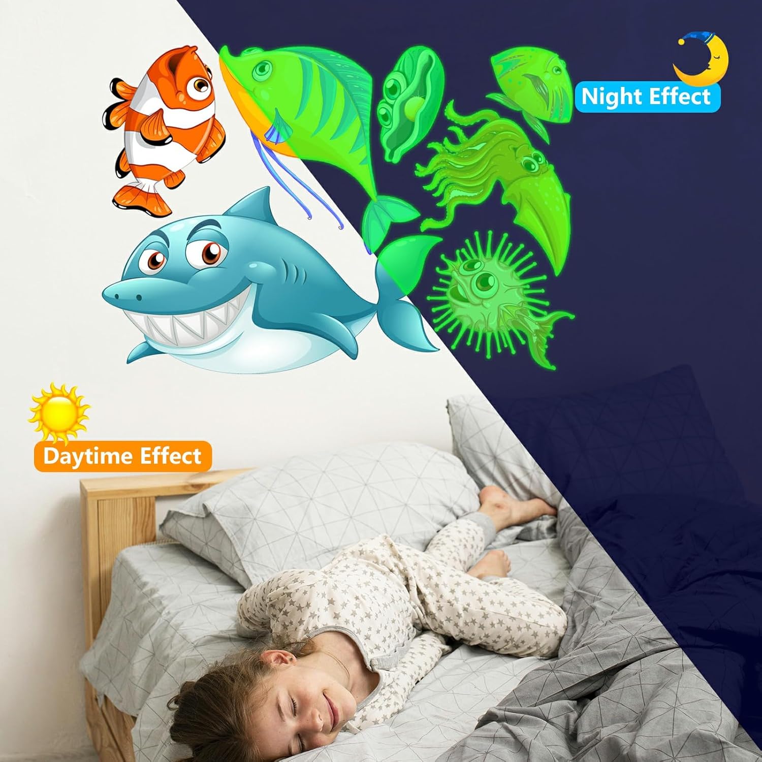 - โฆ Glow Under the Sea Wall Decals: These glow wall decals for ceiling are made of quality luminous material,they will glow brightly when absorb enough light during the day. You just need to put it under lamplight flashlight ,room light or sunshine for 15 minutes, it will keep glowing for 8-10 hours with a gentle green fluorescent light. Please ensure the light shines on the decals without obstruction, the longer it takes to absorb light, then to light up for up to longer.