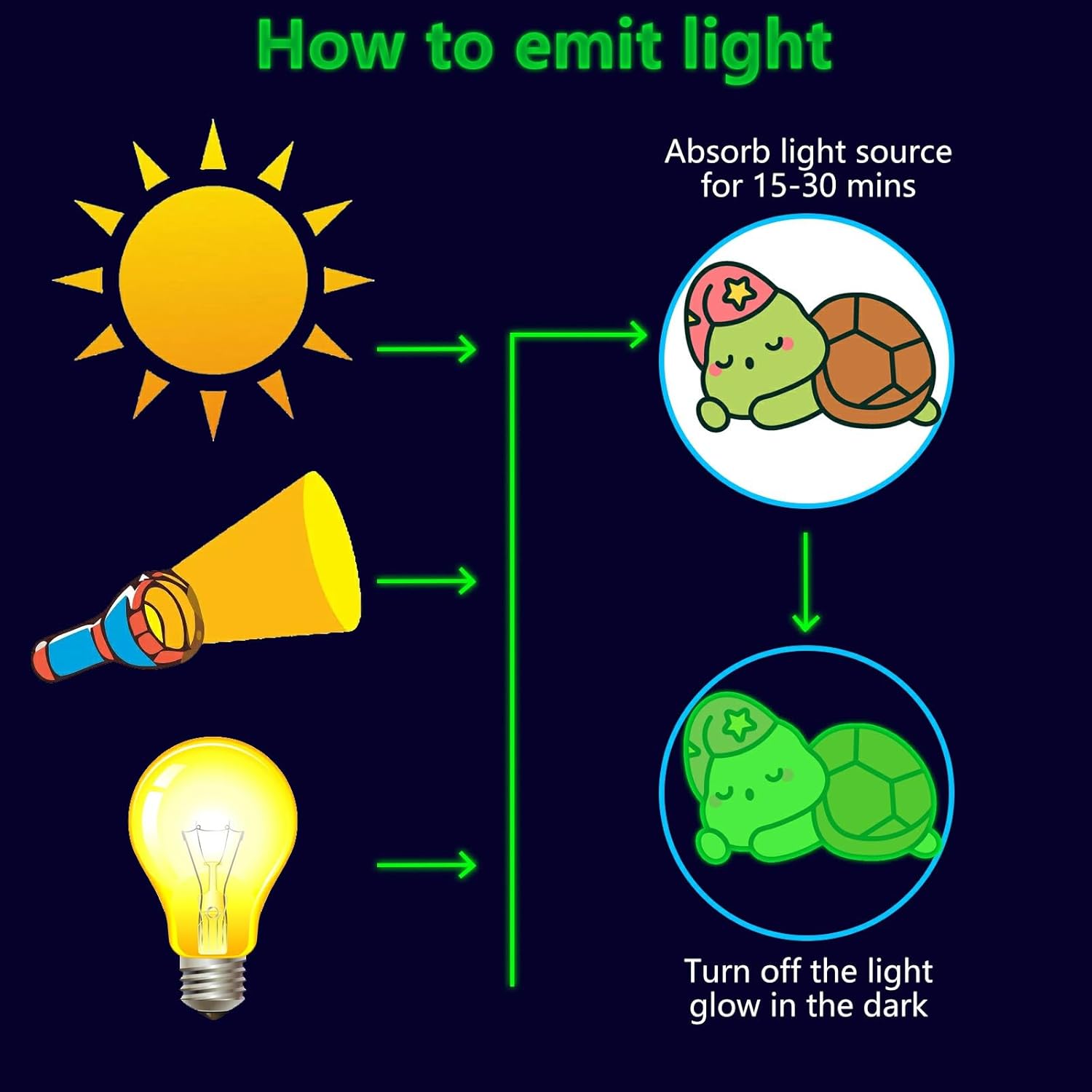 - โฆ Glow Turtles Wall Decals: These glow wall decals for ceiling are made of quality luminous material,they will glow brightly when absorb enough light during the day. You just need to put it under lamplight flashlight ,room light or sunshine for 15 minutes, it will keep glowing for 8-10 hours with a gentle green fluorescent light. Please ensure the light shines on the decals without obstruction, the longer it takes to absorb light, then to light up for up to longer.