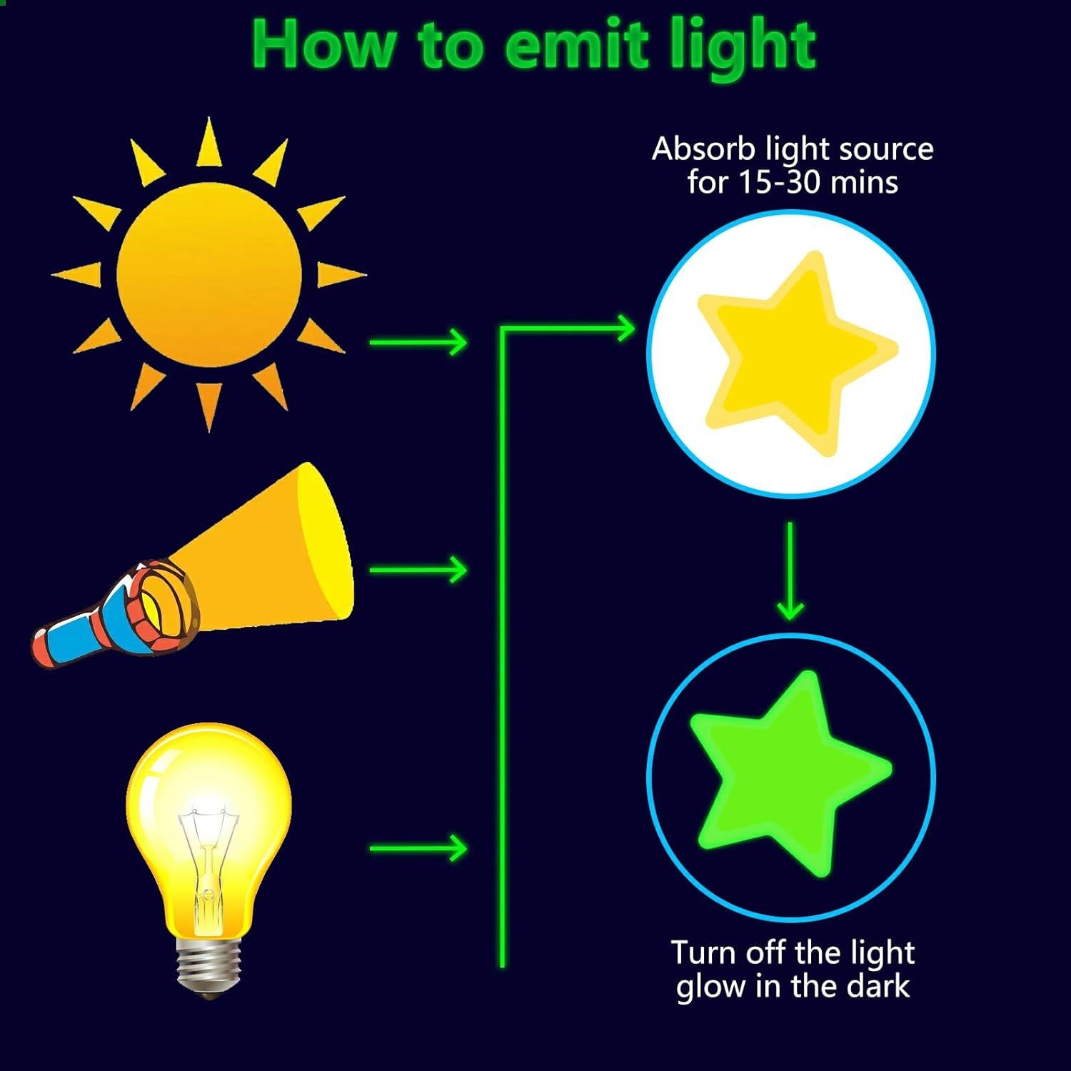 - โฆ Glow Stars Wall Decals: These glow wall decals for ceiling are made of quality luminous material,they will glow brightly when absorb enough light during the day. You just need to put it under lamplight flashlight ,room light or sunshine for 15 minutes, it will keep glowing for 8-10 hours with a gentle green fluorescent light. Please ensure the light shines on the decals without obstruction, the longer it takes to absorb light, then to light up for up to longer.