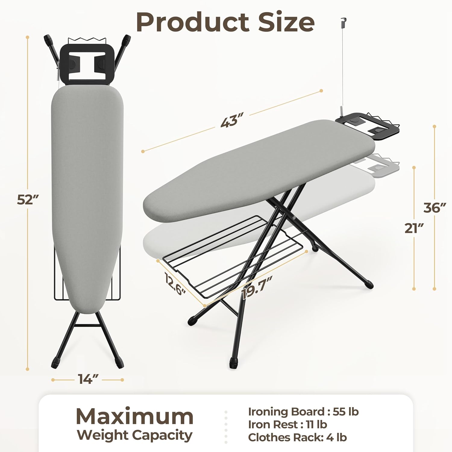 - Full-size Ironing Board: The iron stand provides ample space to meet all your ironing needs. The 43โณ Lร 14โณ W surface ensures an efficient ironing and sewing experience and is ideal for larger garments