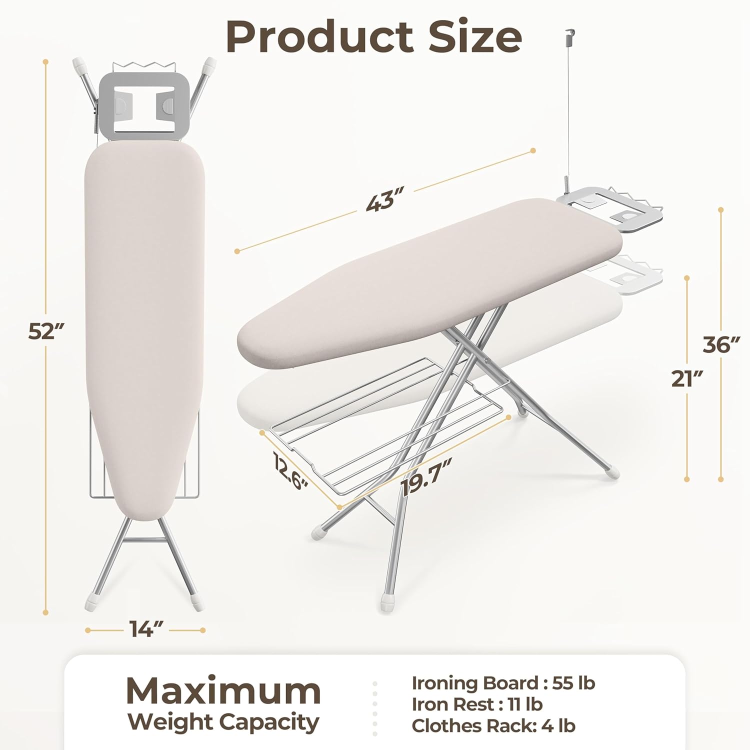 - Full-size Ironing Board: The iron stand provides ample space to meet all your ironing needs. The 43โณ Lร 14โณ W surface ensures an efficient ironing and sewing experience and is ideal for larger garments