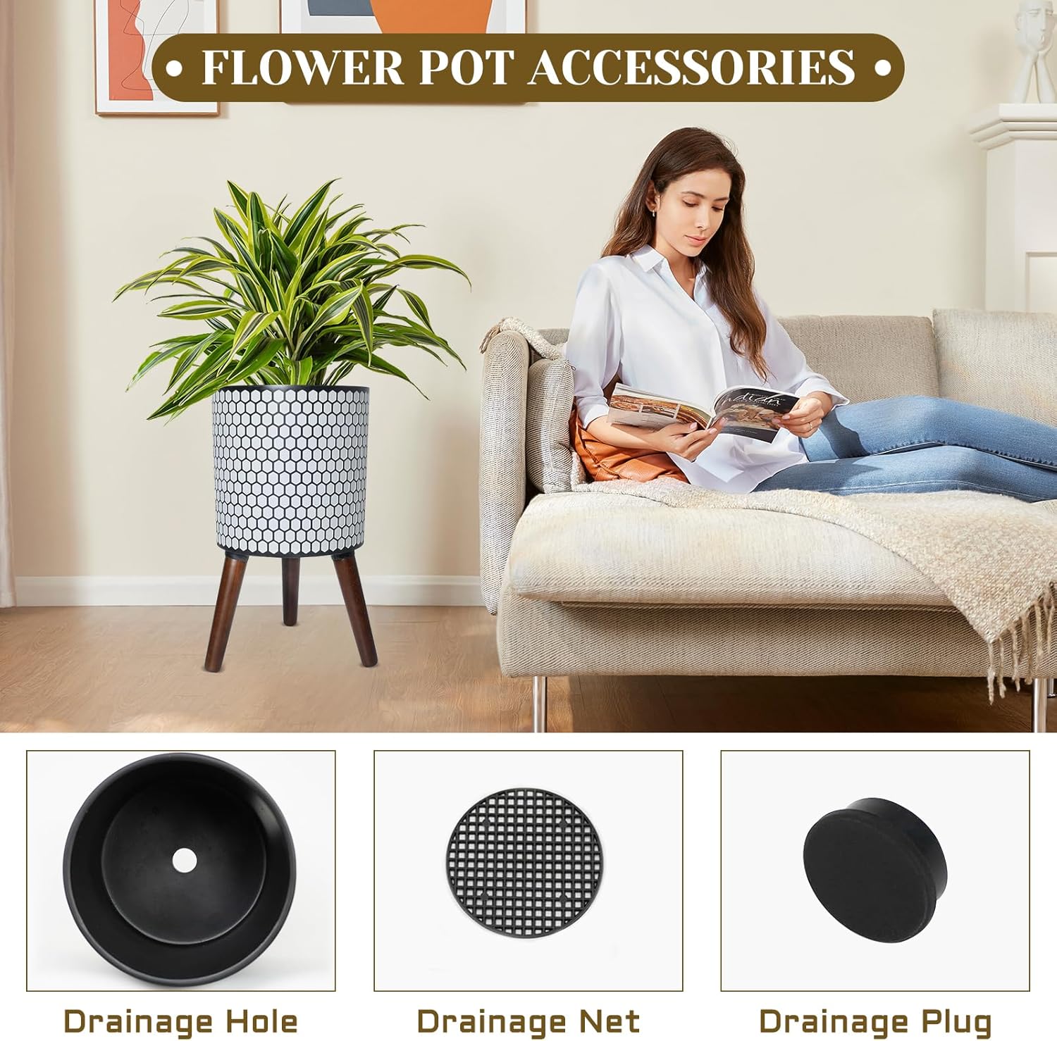 - 【Why Choose A Flower Pot With A Stand? 】This standing plant pot features a 3D honeycomb texture on its surface, seamlessly integrating the natural beehive structure into interior decor. The raised wooden legs raise the flower pot, creating an elegant and orderly atmosphere in the room.