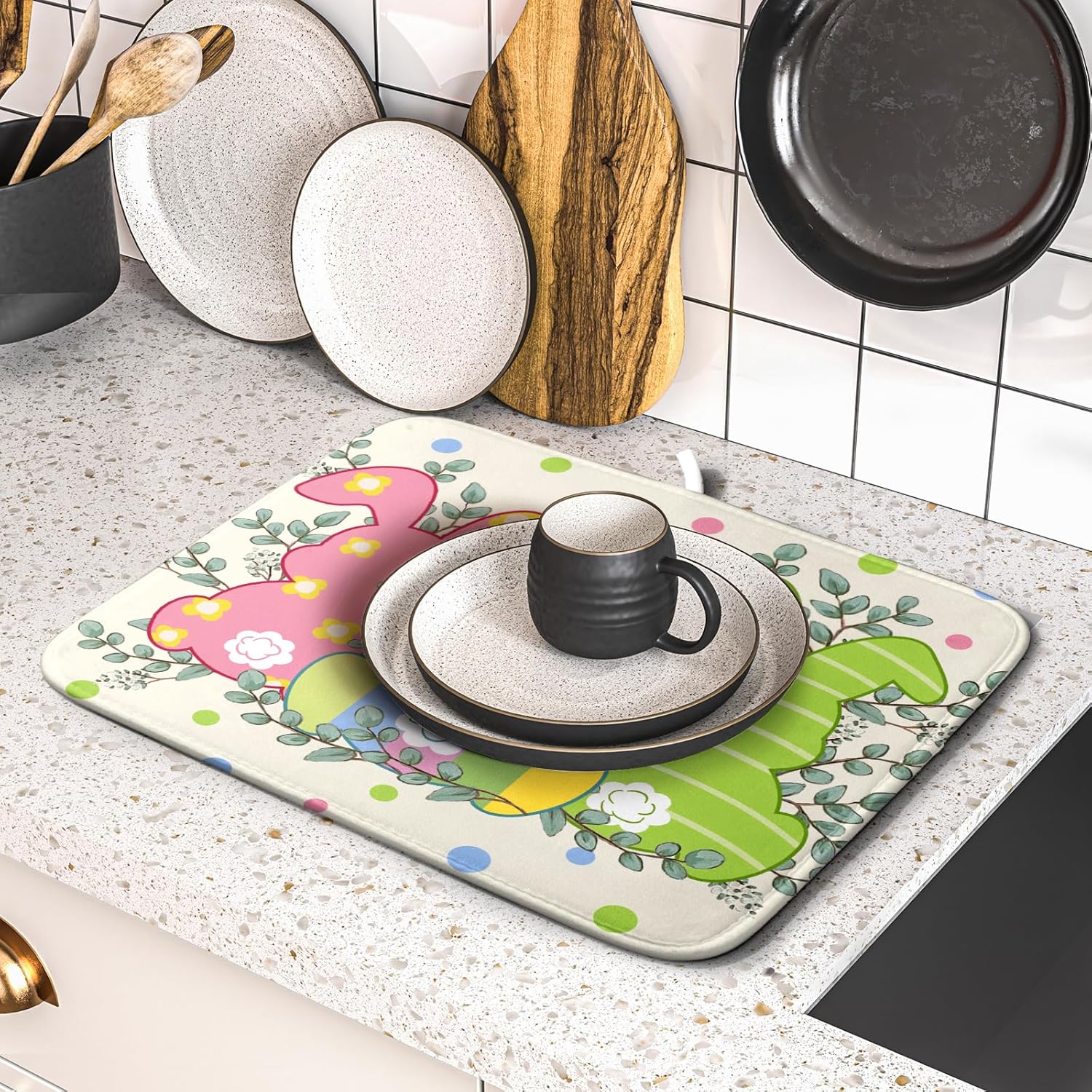 Easter Dish Drying Mat for Kitchen Counter Cute Bunny Rabbit Festival Seasonal Absorbent Reversible Microfiber Kitchen Countertop Protector Dishes Pad Large 16x18 inch