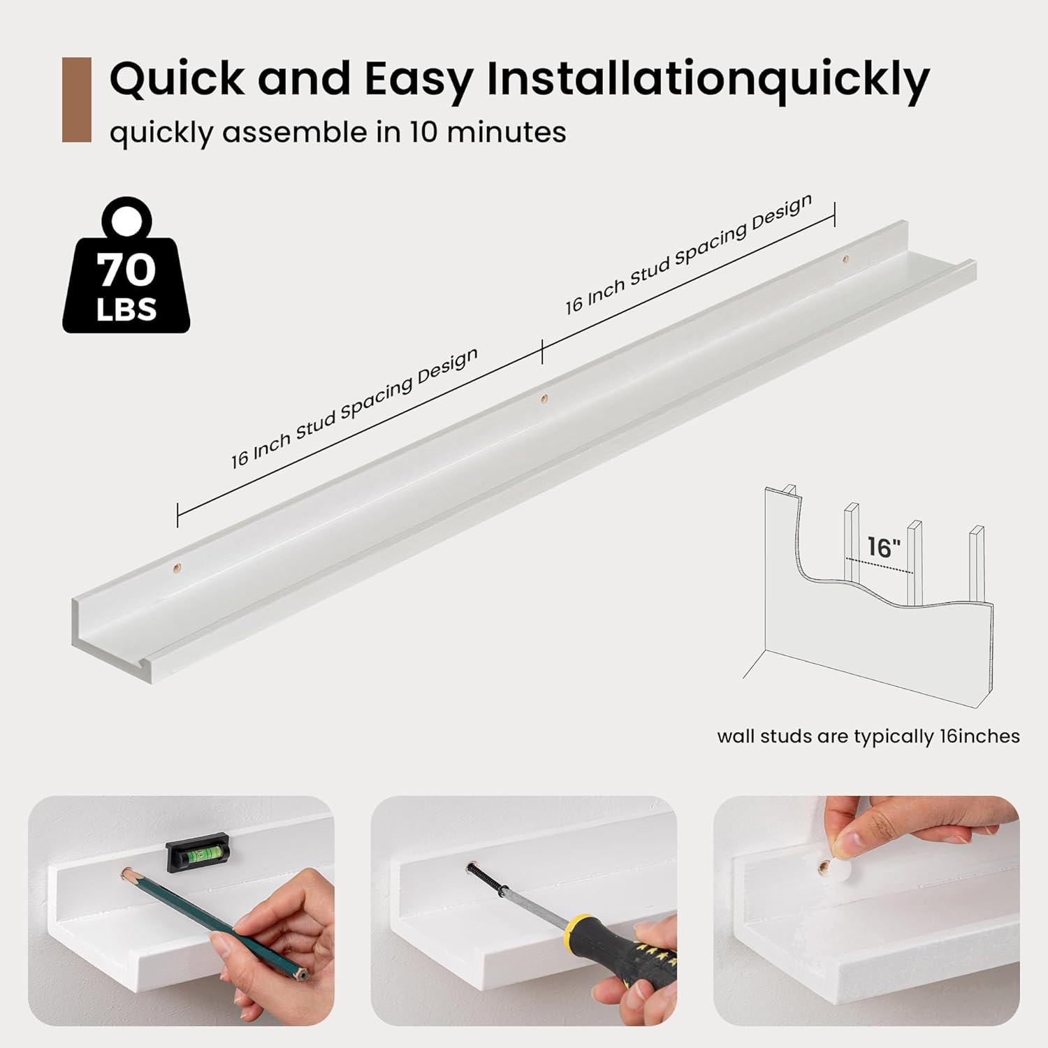- Easy to Install: Fun Memories fully assembled solid pine wood picture ledge shelf set of 2 comes with the pre-drilled holes and necessary hardware including a mini level to make installation a breeze. The floating design creates a seamless, streamlined look, adding a touch of modern sophistication to your interior. If you have any questions about our products, please feel free to contact us