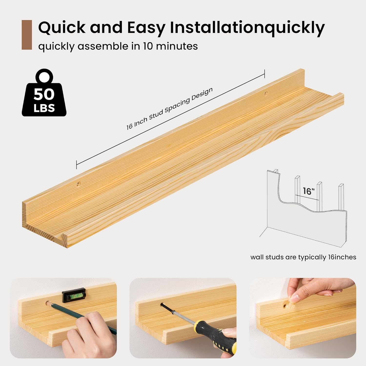 - Unique Solid Pine Wood Shelves: Each picture ledge is meticulously handcrafted from premium solid pine wood, showcasing one-of-a-kind grain patterns, organic color variations, and a hand-finished texture. No two shelves are identical—transform your space with a bespoke touch that reflects your individuality