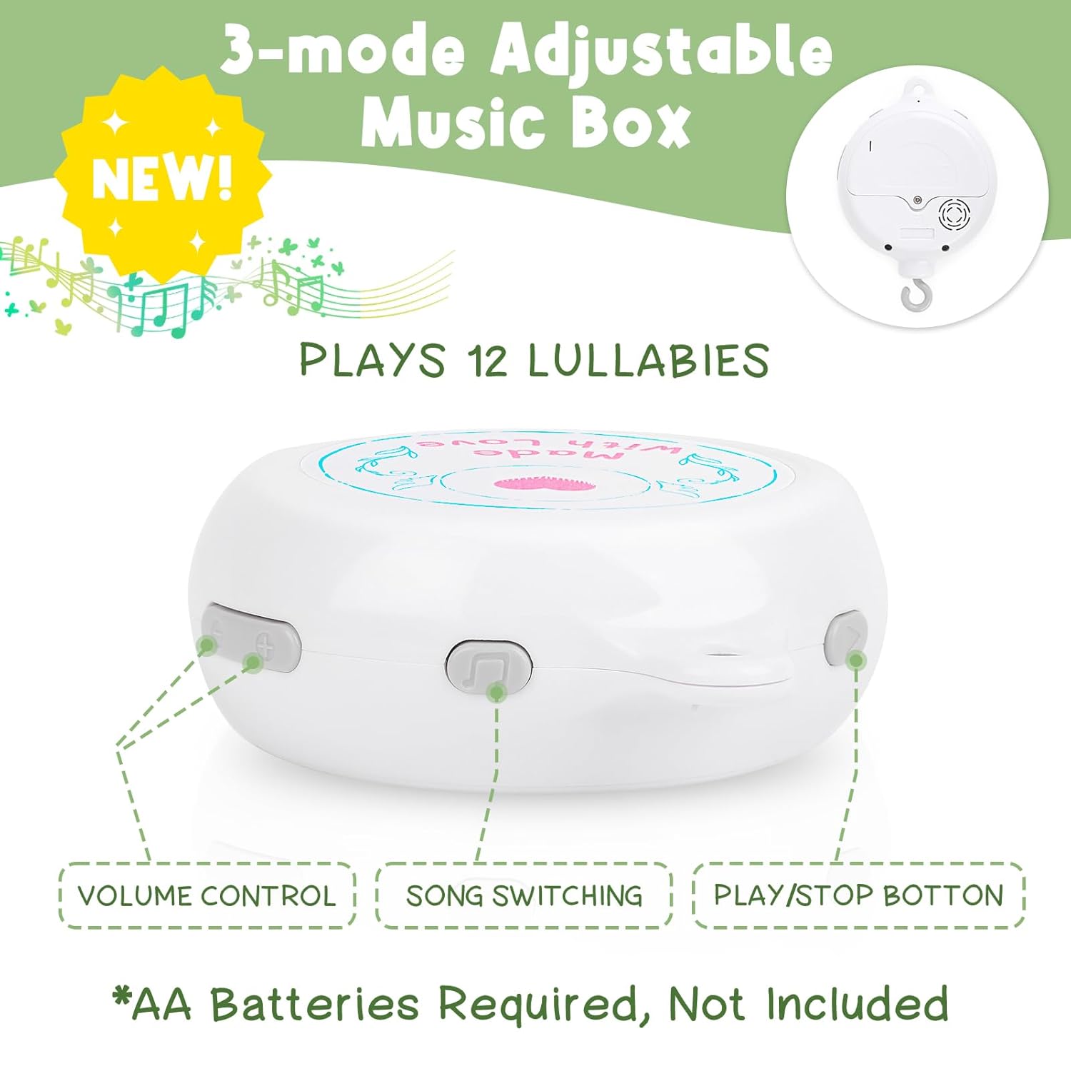 - 12 Soothing Lullabies: The newly upgraded 3-mode adjustable music box lets you choose between Rotation Only, Music Only, or Both. As the gentle melodies play, the toys slowly spin, creating a calming atmosphere that makes bedtime a smoother and more enjoyable experience for both baby and parents