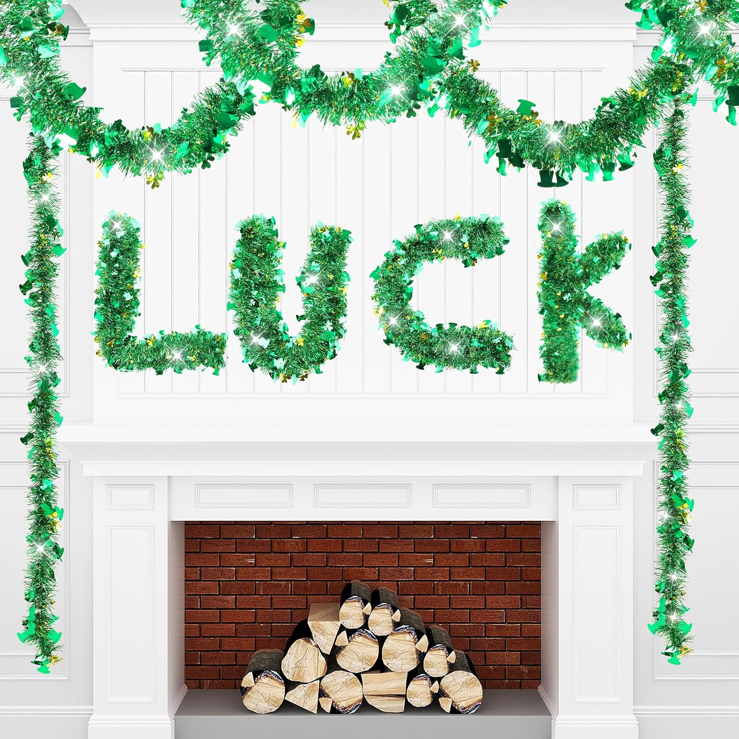 33 FT St Patricks Day Garland with Gold Green Shamrock Hat Tinsel Garland,Shiny Metallic Garlands St Patricks Day Decor for Home Indoor Outdoor St Patricks Party Supplies