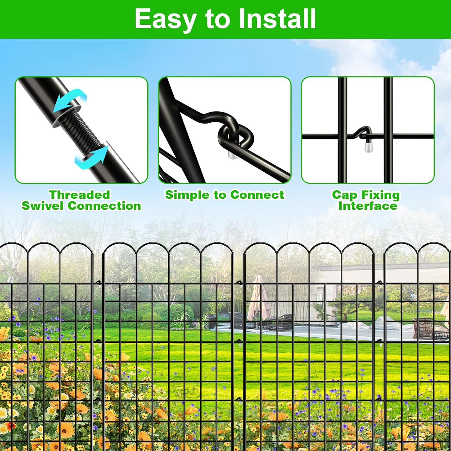 - Simple to Install and Easy to Carry: No complicated tools are required.You simply place the two fence panels facing outwards and align the rings, then snap the two panels together and secure them by aligning the grommets. Easily create a beautiful garden fence without complicated installation process Whether a beginner or an experienced gardener, you can have a sturdy fence up in no time