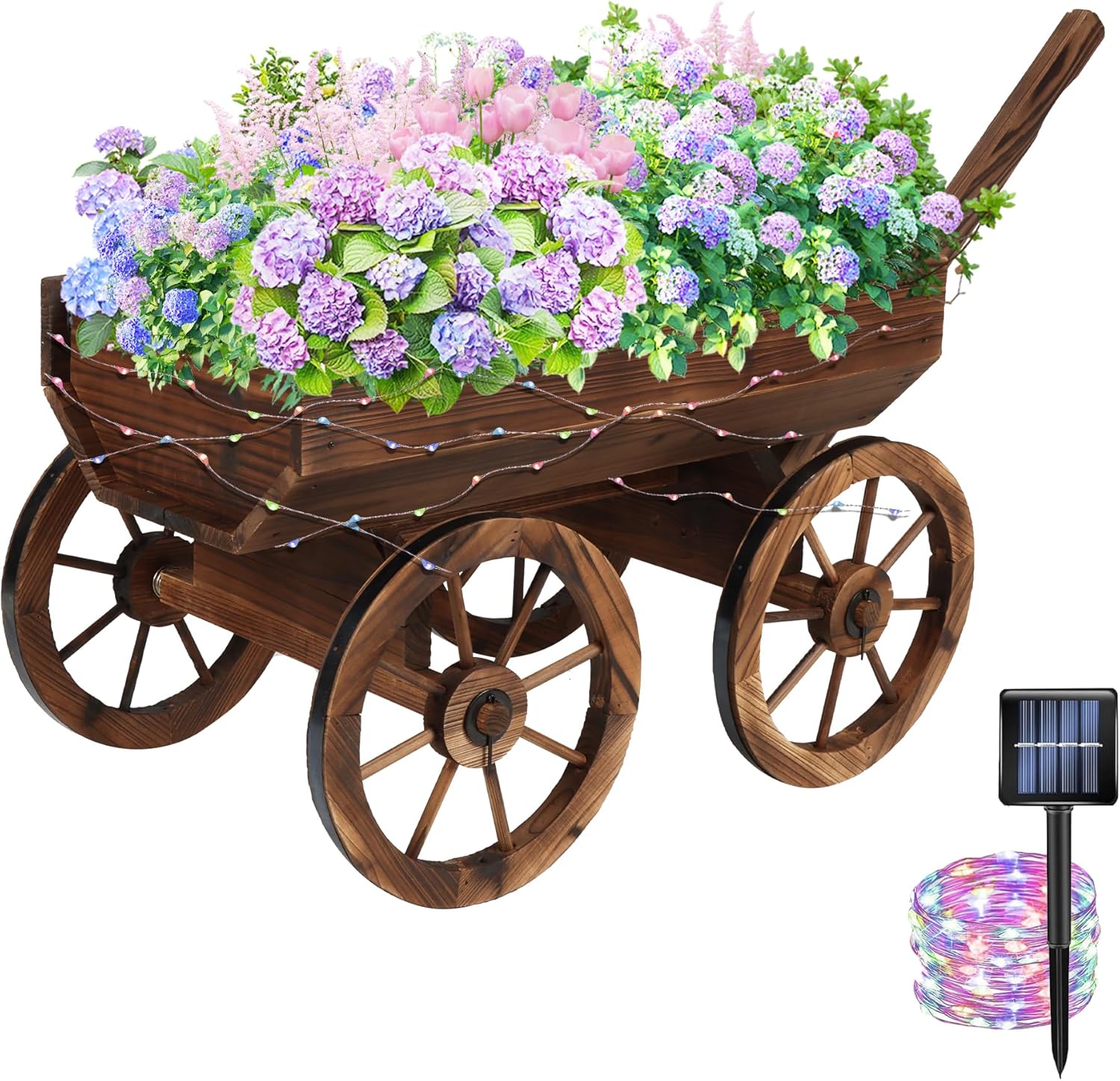 - 【LONG-LASTING】: Made of high quality fir wood, this wagon planter ensures long-lasting use while complementing your outdoor space. In addition, the hub has iron reinforcement for long-lasting use.