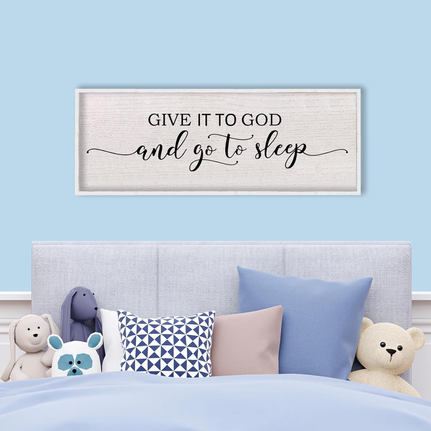 Give It To God And Go To Sleep Above Bed Wall Decor Sign 40"X15" Master Bedroom Over Bed Wall Wood Framed Art (White)