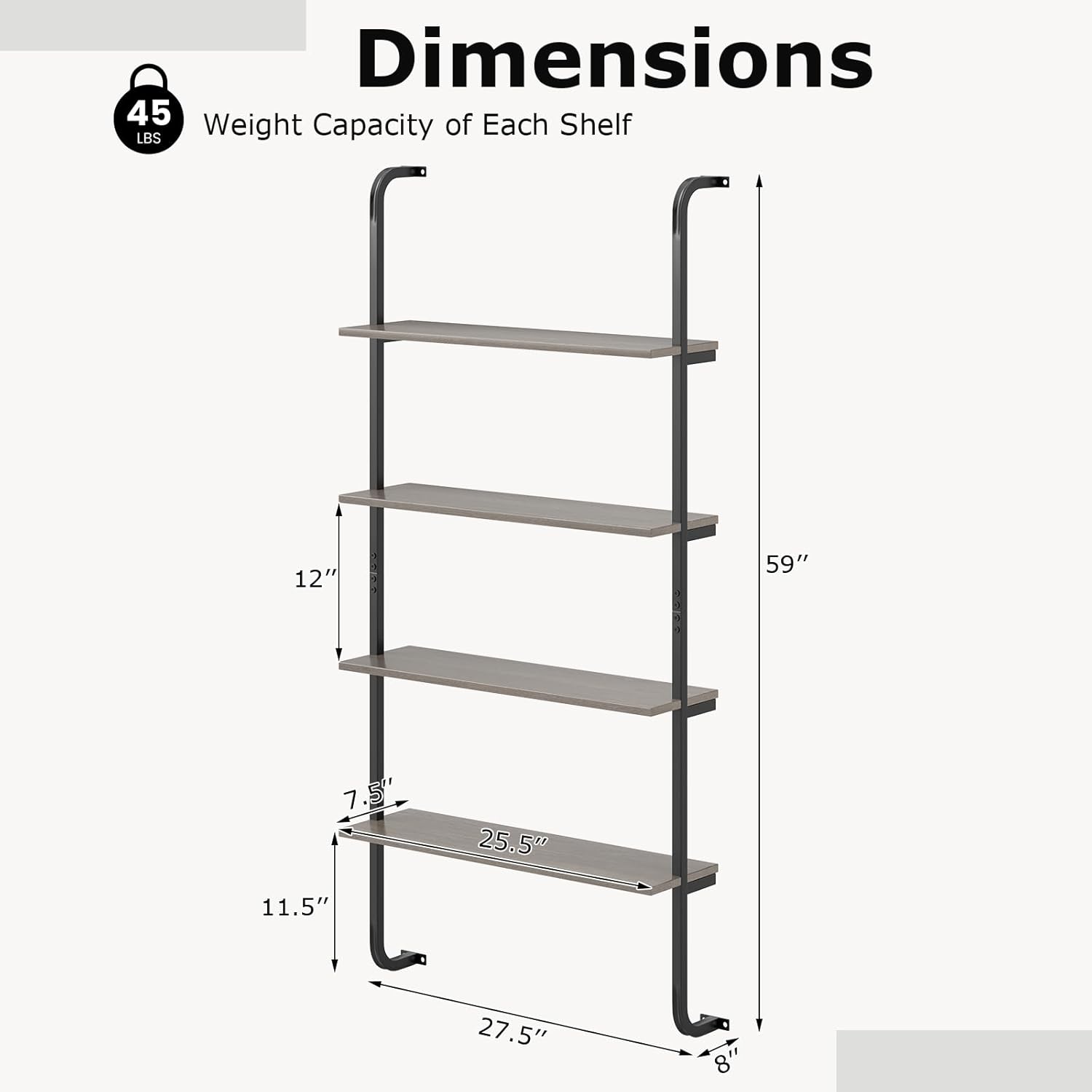Giantex 4-Tier Industrial Bookshelf, Wall Mounted Pipe Shelving Unit, Floating Shelves with Metal Frame, Hanging Wall Display Shelf, Wood Ladder Bookshelf for Living Room, Kitchen,Gray Oak