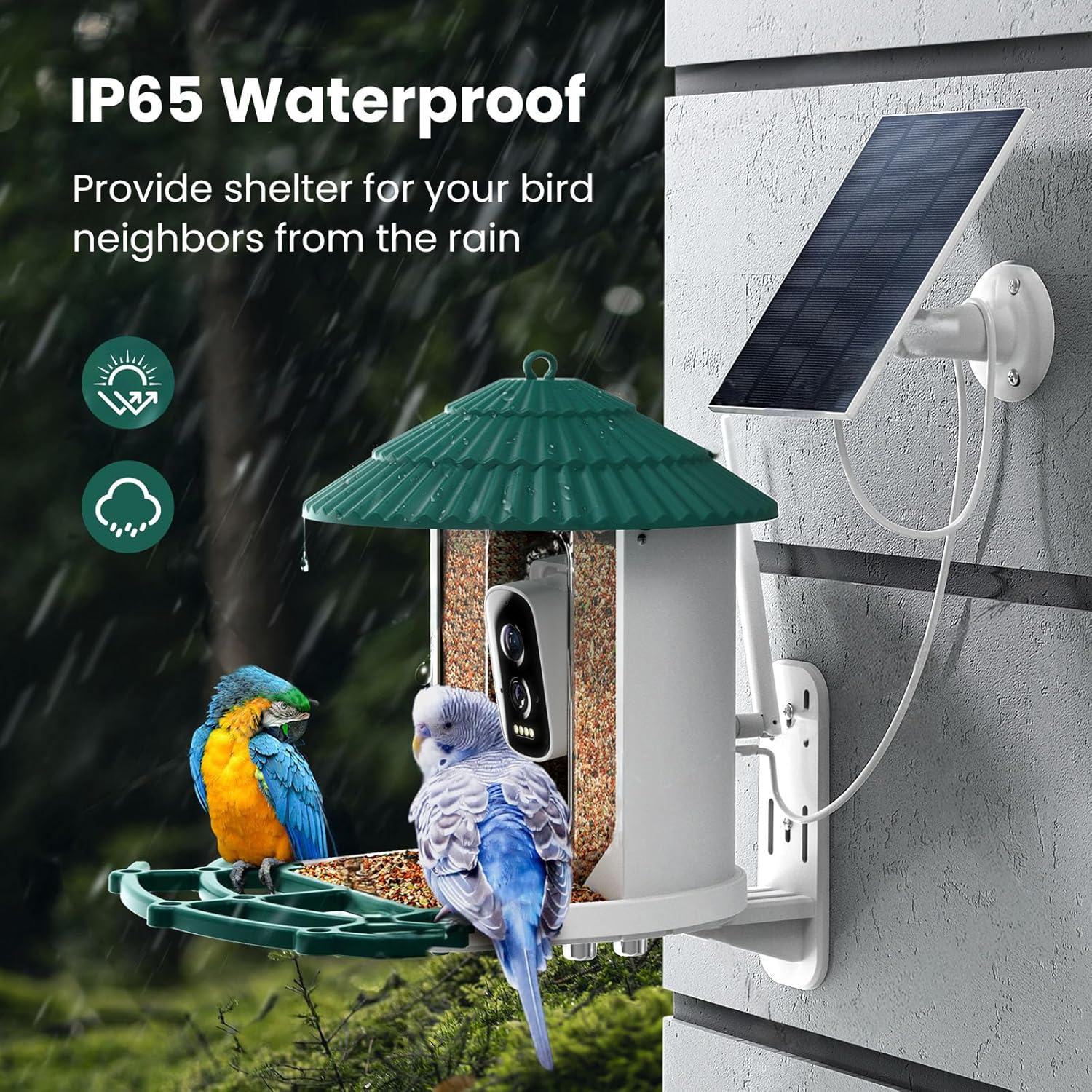- Solar-Powered & Weatherproof Design: Wild bird feeders with built-in 4000mAh battery with a solar panel for efficient charging. IP65 waterproof and UV-resistant materials ensure durability in all weather conditions.