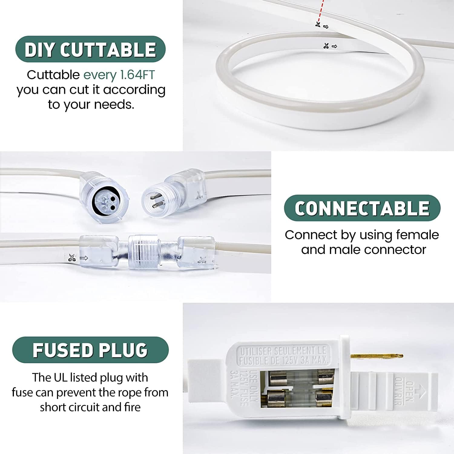 - Cuttable & Connectable--GZBtech AC 110-120V outdoor waterproof led strip lights can be cut in every 20inches/0.5m along the cutting marks, you can cut it according to your needs. By using male and female end-to-end for easy connection, plug and play without wiring. This is a 0.31''(W)x0.63" (H) heavy-duty rope light. If you need a smaller neon strip with higher lumens, please click visit the store on the top of this page to view it.
