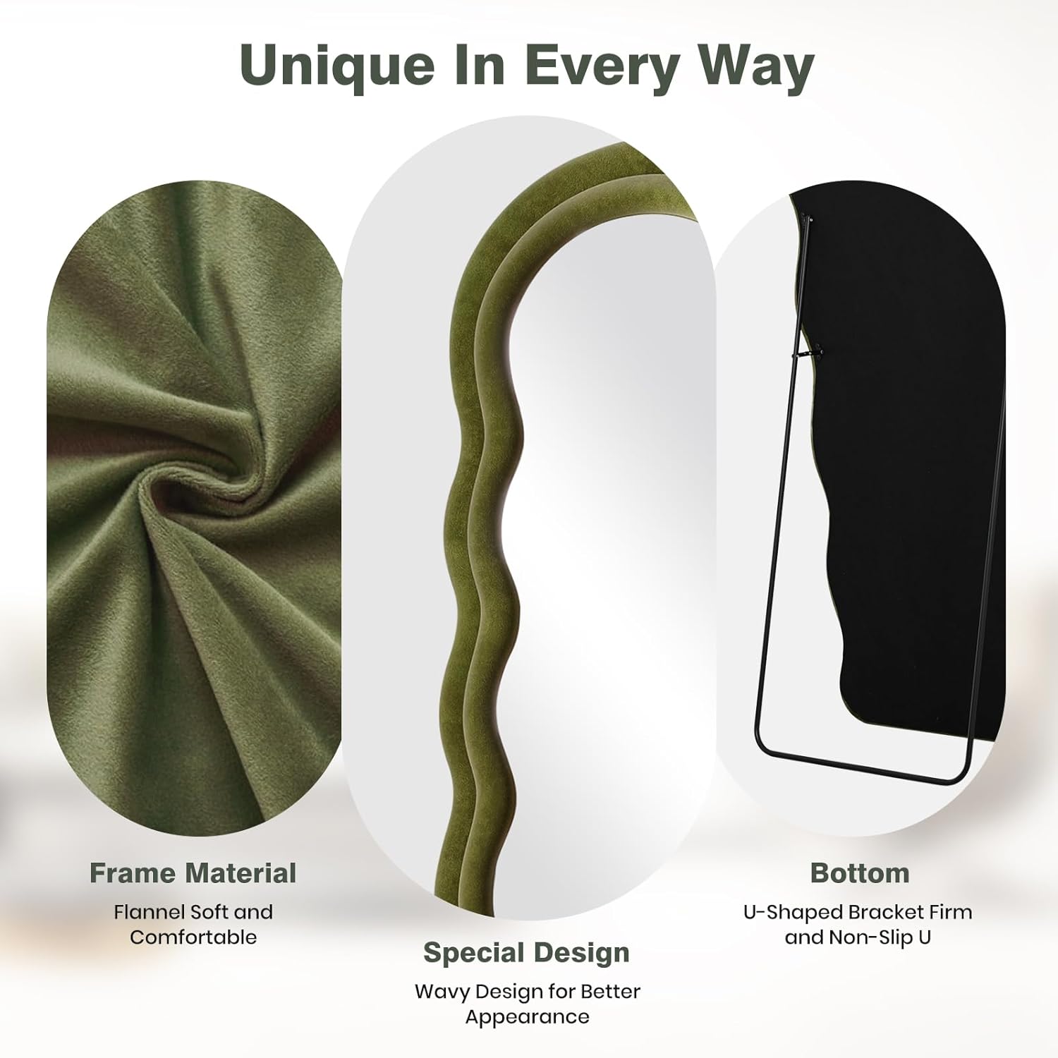 - Green Flannel Irregular Wavy Frame Floor Mirror: The full length standing mirror features a modern style that can complement any type of room decor, adding a touch of elegance to your room. It will be a great wall decor art piece for your home. This full body mirror with sleek looking is also great for selfies or pictures in general