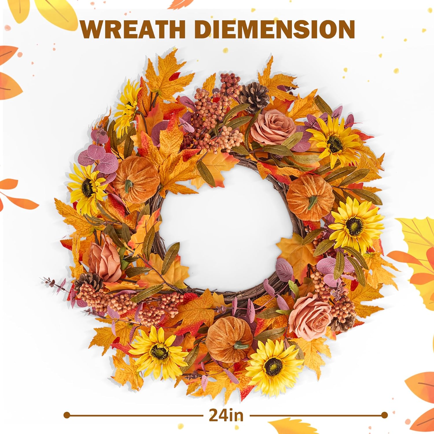 - 【Ideal Size】: The fall door wreath is designed to be the perfect size for most doors and walls. When fully unfolded, it measures approximately 22-24 inches in diameter. This size ensures that it makes a bold statement without being overwhelming. The wreath is also easy to reshape, allowing you to fluff and expand the elements to achieve the desired fullness and volume, making it look even more beautiful and inviting.