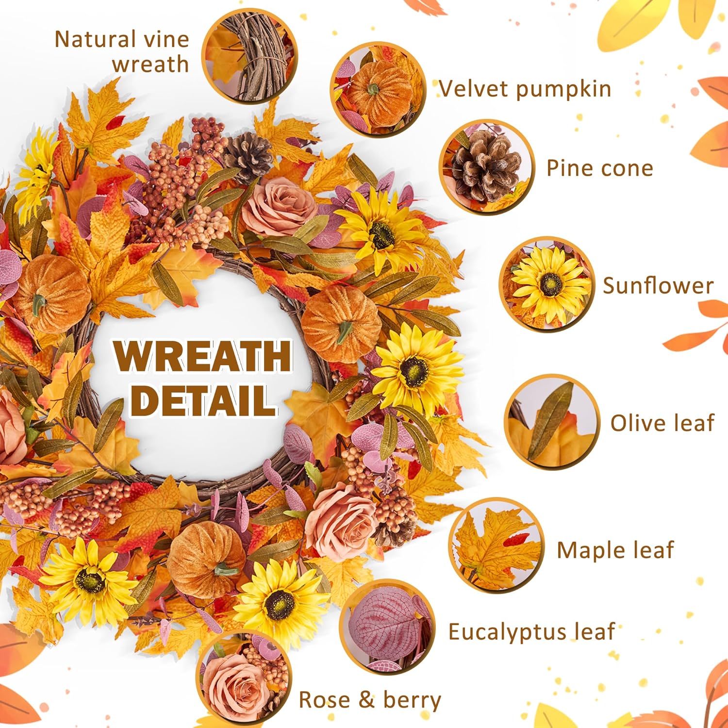 - 【Eye-catching Design】: The autumn harvest front door wreath is a stunning outdoor fall decoration that captures the essence of the season. It is intricately crafted with a variety of natural elements, including pumpkins, multicolored eucalyptus leaves, plant vines, and vibrant Sunflower. The rich autumn colors and unique design make it a standout that piece will surely draw attention and admiration from passersby.