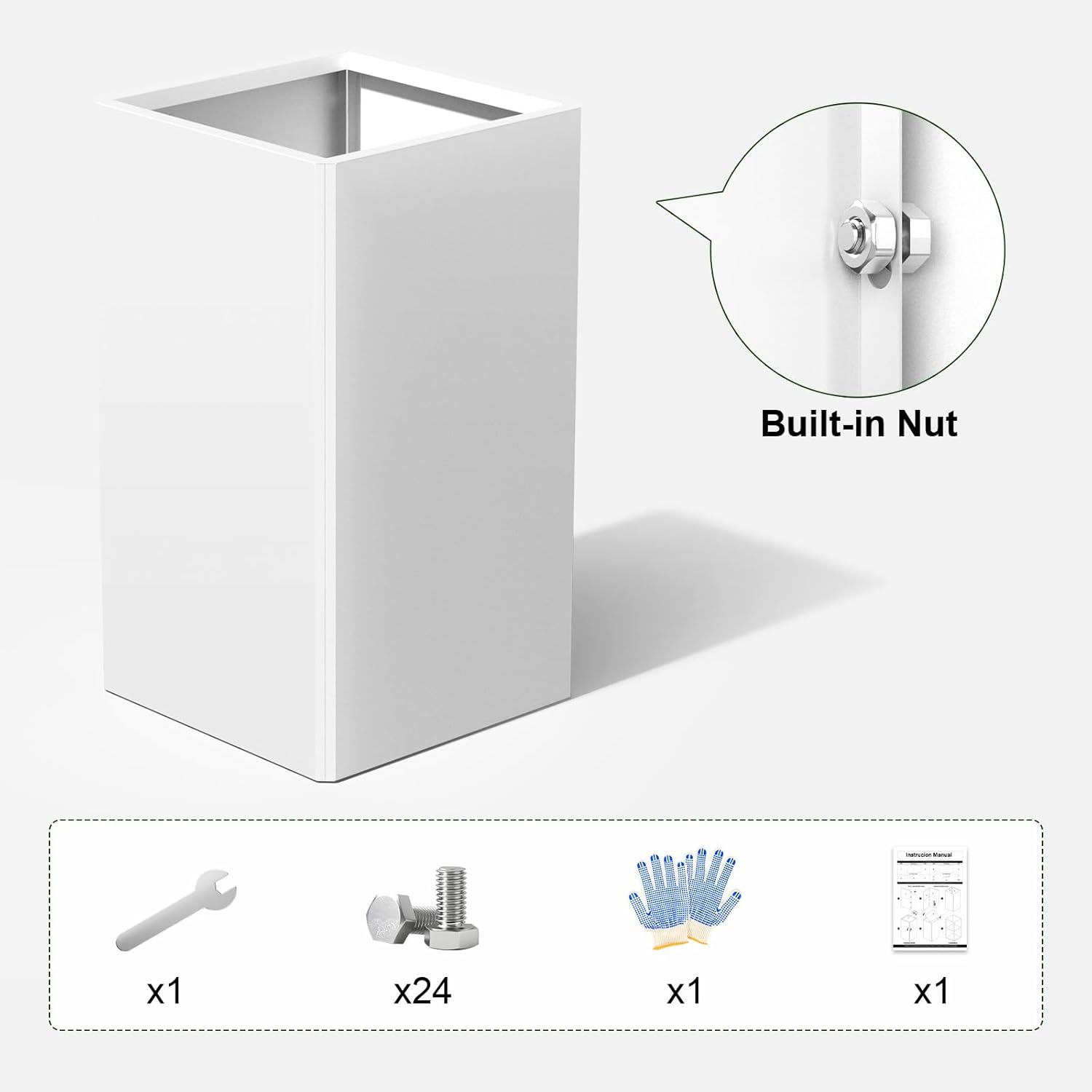 - White & Tall Metal Planter - 14" L x 14" W x 26" H, The tall planter box is equipped with 24 screws, a wrench, protective gloves and instructions. Note: This large metal outdoor flower pots needs to be assembled
