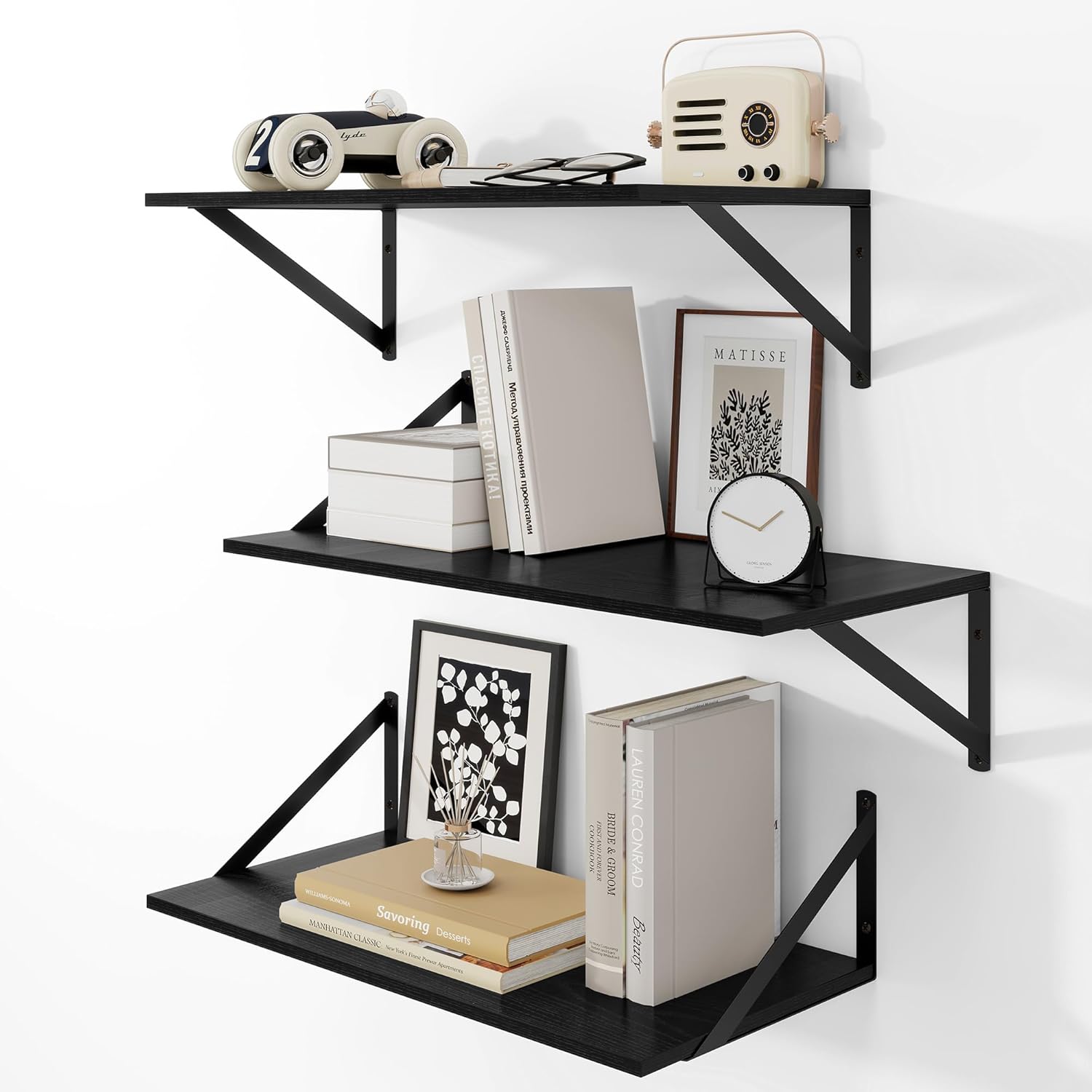- Effortless 10-Minute Installation: All necessary hardware is included in the package. With pre-drilled mounting holes and detailed step-by-step instructions, these wide floating shelves can be securely installed in just minutes. Package Contents: 3 wooden boards (24" W x 12" D), 6 steel brackets, 13 anchors, 13 long screws, 13 short screws, 1 level, 1 installation manual.