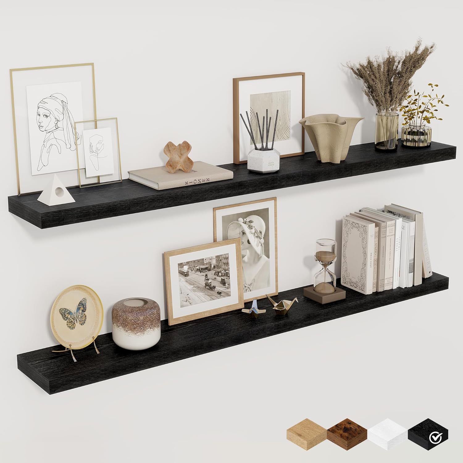 Floating Shelves for Wall, 48 Inch Floating Shelves for Home Decor, Wall Mounted Rustic Wood Shelves, Bathroom, Hanging Deep Shelf for Bedroom, Living Room, Kitchen (Black, Set of 2)