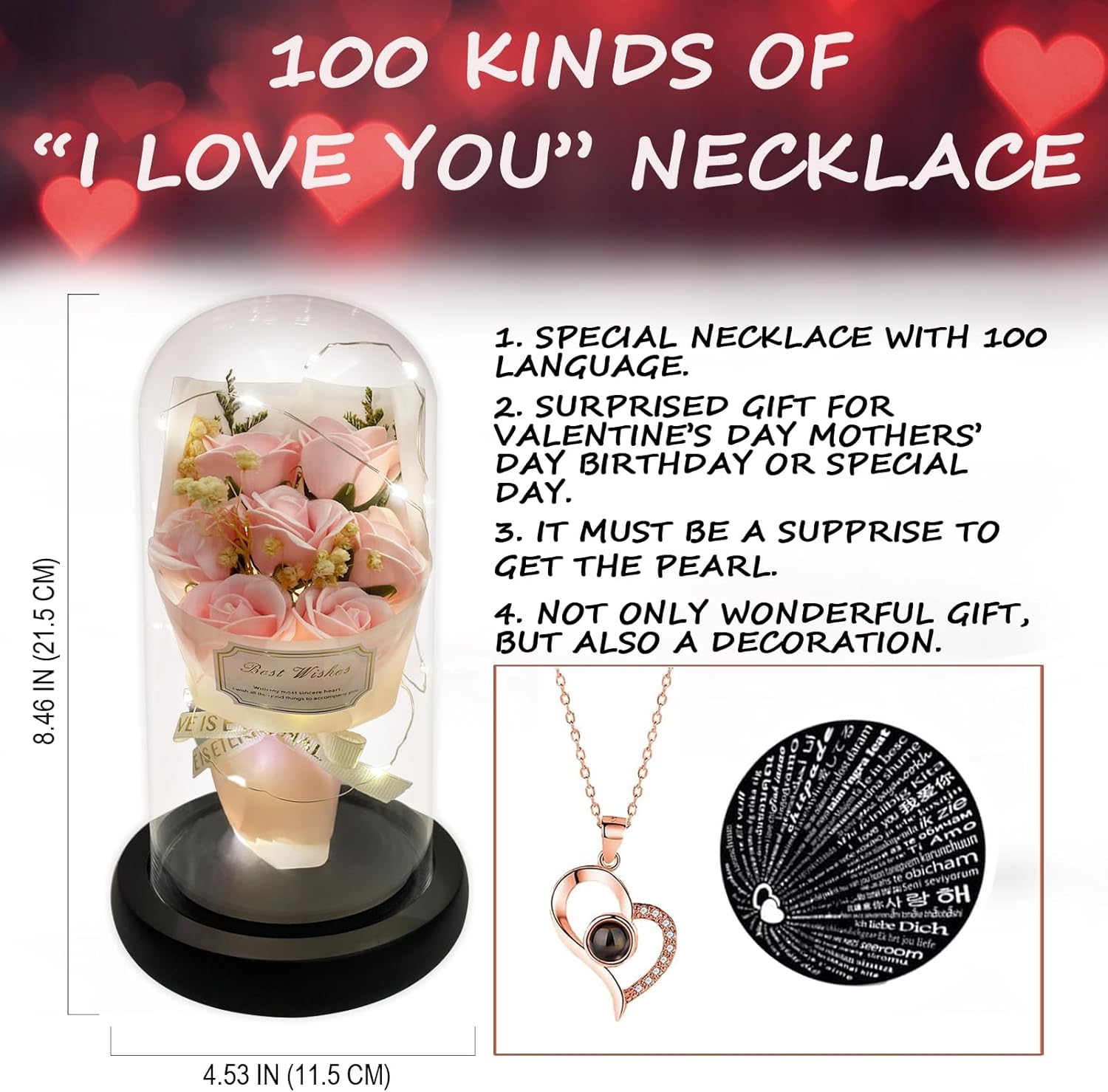 - 【UNIQUE BIRTHDAY GIFTS FOR HER】: Uniquely designed heart necklace and beautiful forever flowers bouquet make a well-presented gift. A charming eternity flower and a I LOVE YOU necklace will be kept in your memories with with your happiness time. It will be a perfect birthday gift for your mother, wife and girlfriend.