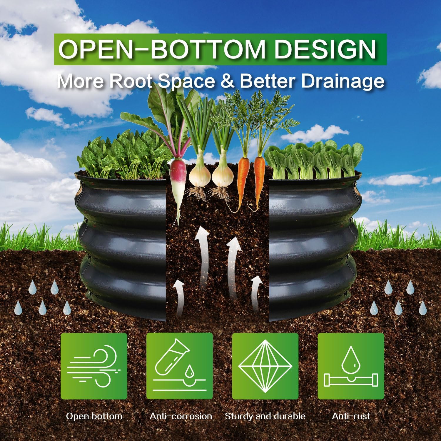 - OPEN BOTTOM DESIGN: GARDMAX galvanized planter raised beds are designed with an open bottom, which is good for drainage to protect plants, plant roots won't be sick from excessive water. It also keep weeds away from soil and keep out chicken small pets like puppies, rabbits to protect your plants