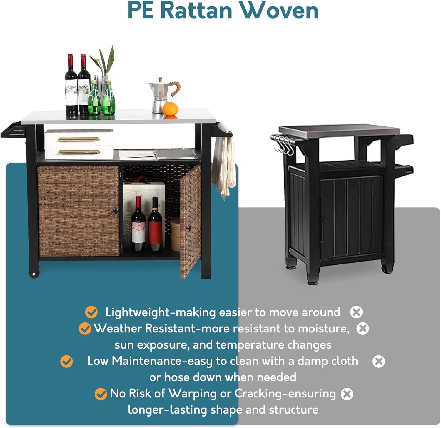 - VERSATILE FUNCTIONALITY: The stainless steel top of the wicker bar cart doubles as a prep station, making it highly functional for various use. Use it to organize your bar tools, set up a grilling station, or serve appetizers at your next outdoor party