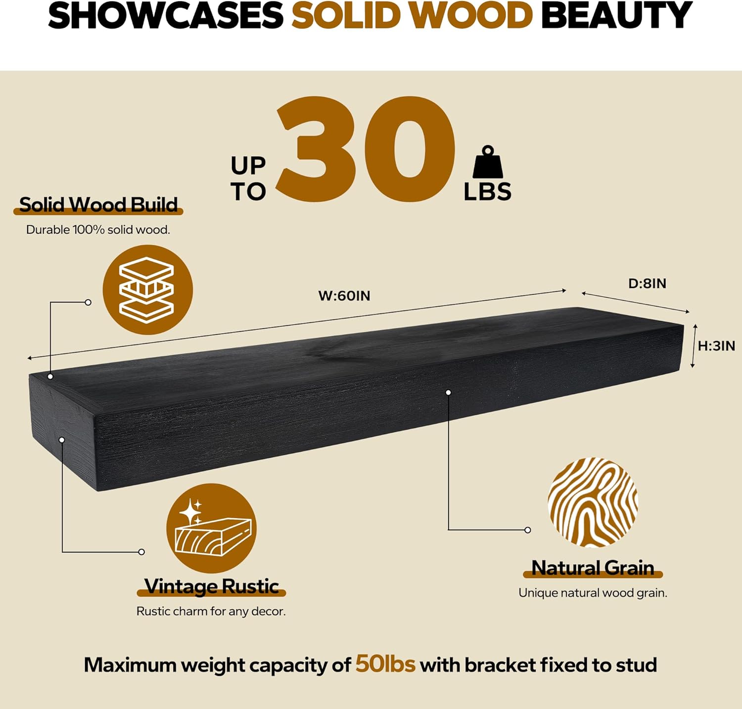 Floating Shelves 3 inch Thick for Wall Set of 2,Solid Pine Wood Wall Mount Shelf for Kitchen Living Room Bedroom Bathroom,8" D x 60" L x 3" H-Black