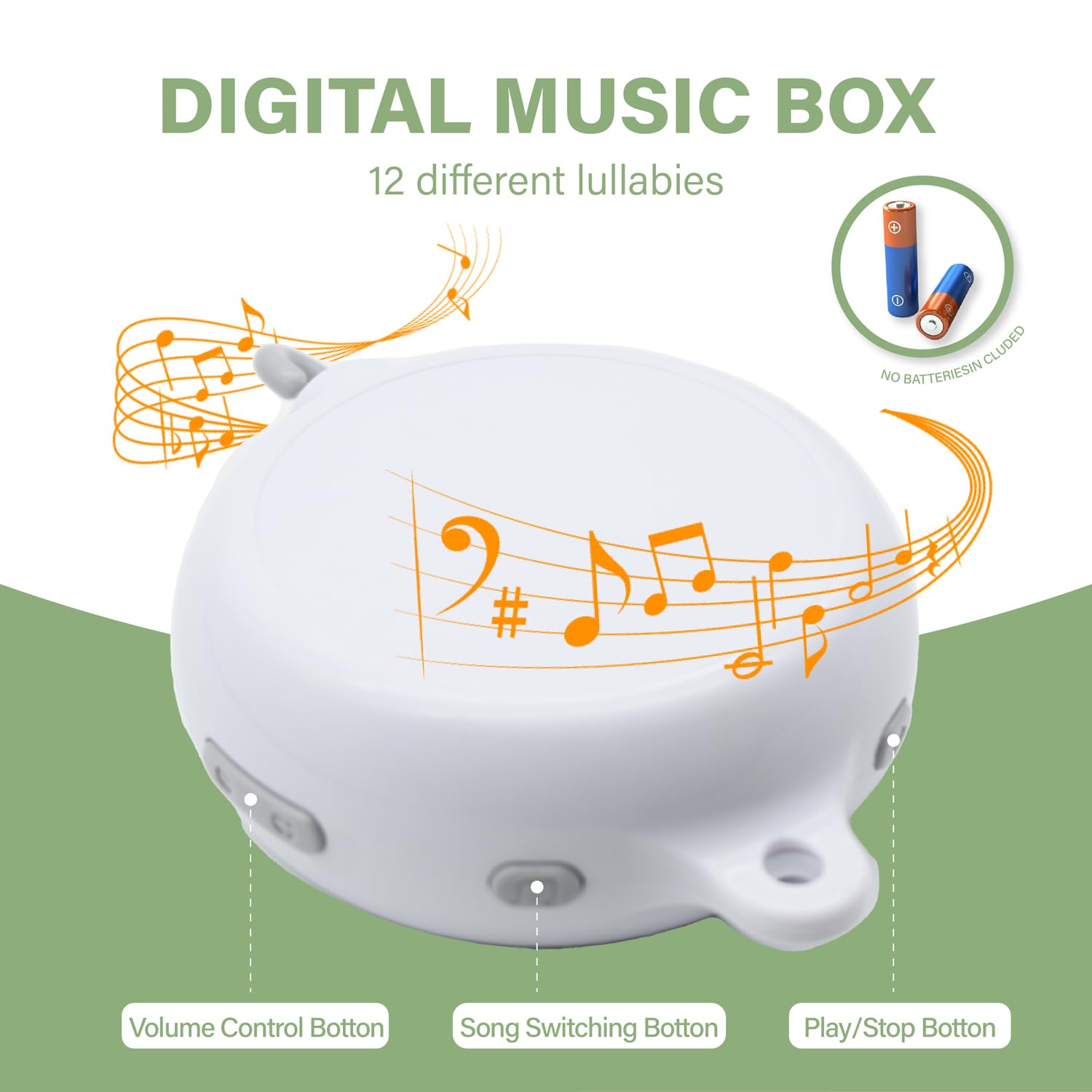 - 【12 Gentle Lullabies】The music box features a convenient on/off switch, an adjustable volume control button, and a button that allows easy switching between tracks. As the music plays, crib toys hanging gently rotate, help lull babies to sleep peacefully.