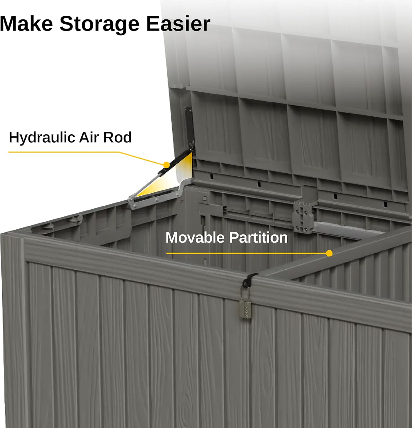 - ๐ฆ๐๐๐ ๐๐ก๐ ๐จ๐ฆ๐๐ฅ-๐๐ฅ๐๐๐ก๐๐๐ฌ ๐๐๐ฆ๐๐๐ก: Featuring a hydraulic lever mechanism, this outdoor storage box ensures smooth and safe operation, eliminating the risk of hand injuries. Inside, a detachable partition allows for organized, sectioned storage of your items.