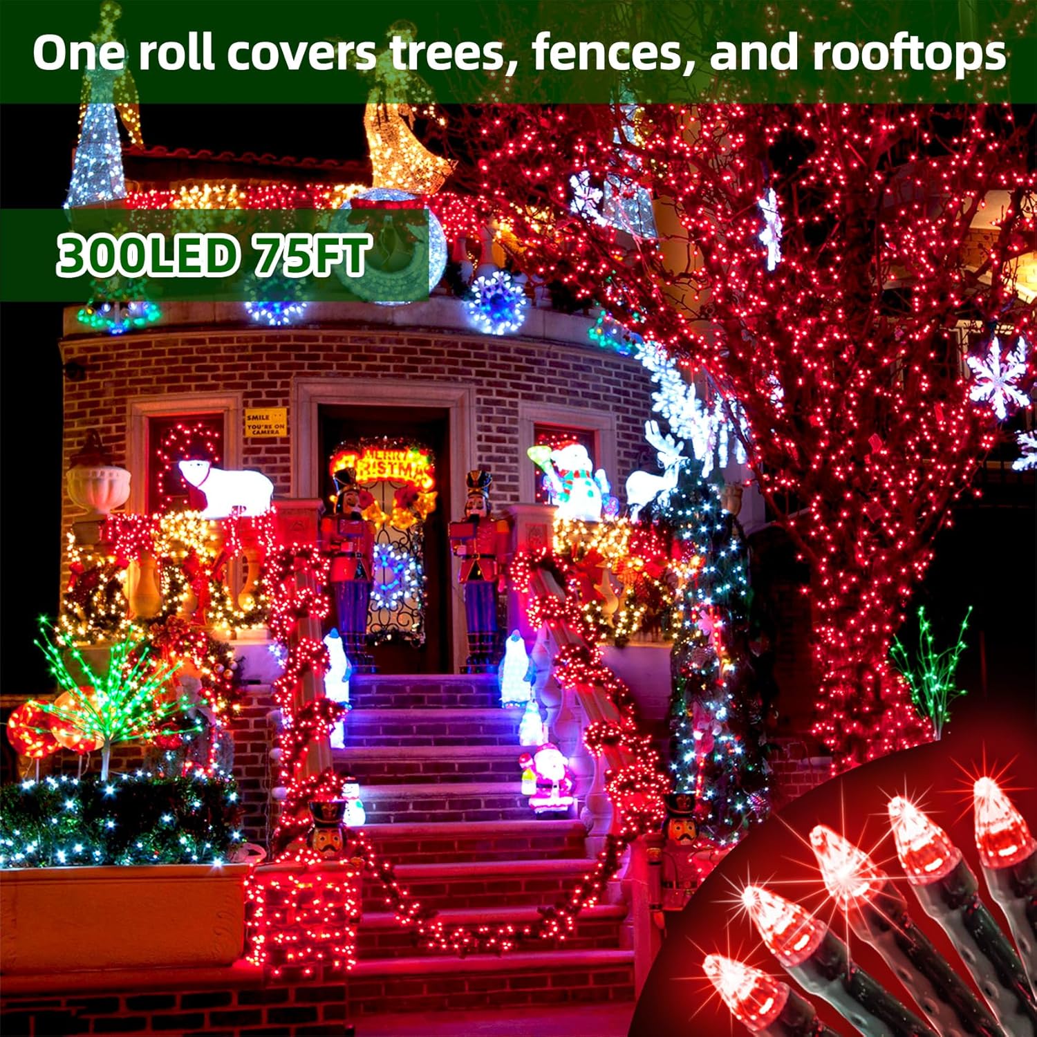- Perfect Size for Everyday Decorating: At 75ft with 300 LEDs in red, these Christmas string lights fill your home with a warm, festive glow. The perfect length for balconies, porches, stair railings, mantels, or a 7–9ft Christmas tree. Not too long, not too short—ideal for cozy holiday nights. Connect up to 3 sets (225ft, 900 LEDs total) to bring bold Christmas spirit to fences, patios, or the housefront.