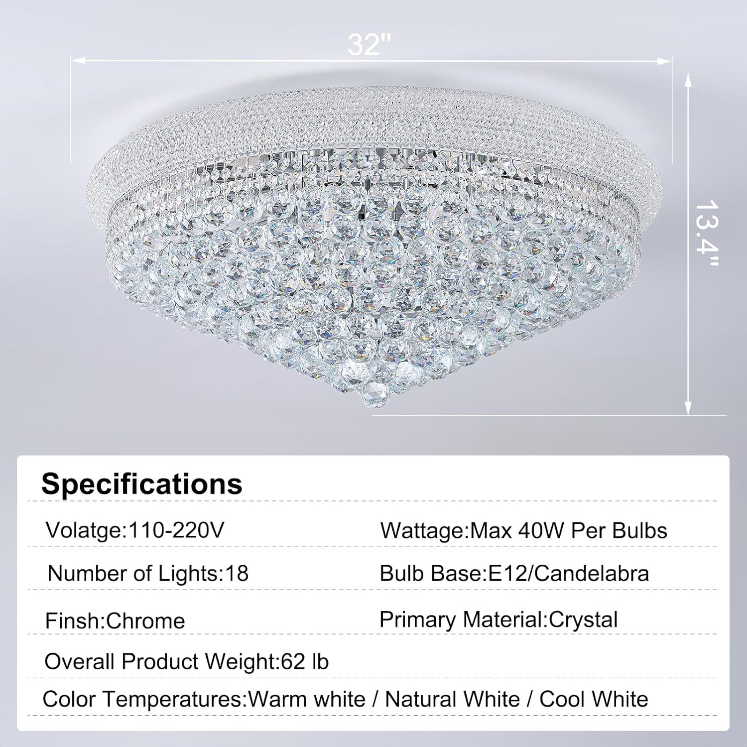 18-Light 32 inch Large Crystal Chandelier Flush Mount Ceiling Light Fixture for Living Room Dining Room Bedroom Foyer Entryway Chrome Finish