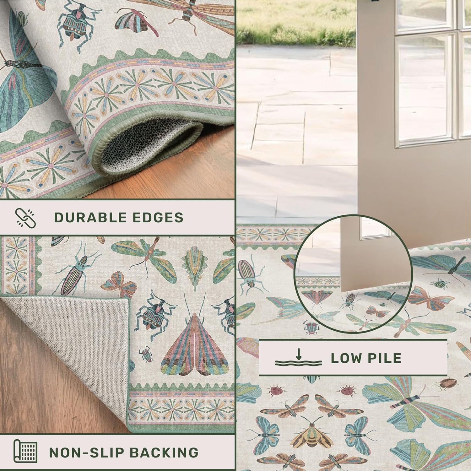 - Playful Botanical Charm: Add whimsical elegance with delicate butterflies and moths on a soft ivory background. Muted sage green, dusty teal, blush pink, and vintage coral create a fresh, nature-inspired cottagecore palette. Featuring a symmetrical layout and scalloped edge echoing antique entomology prints, it blends vintage science with modern decor. Perfect for kids' rooms, nurseries, living room, or garden-inspired interiors to add personality and color