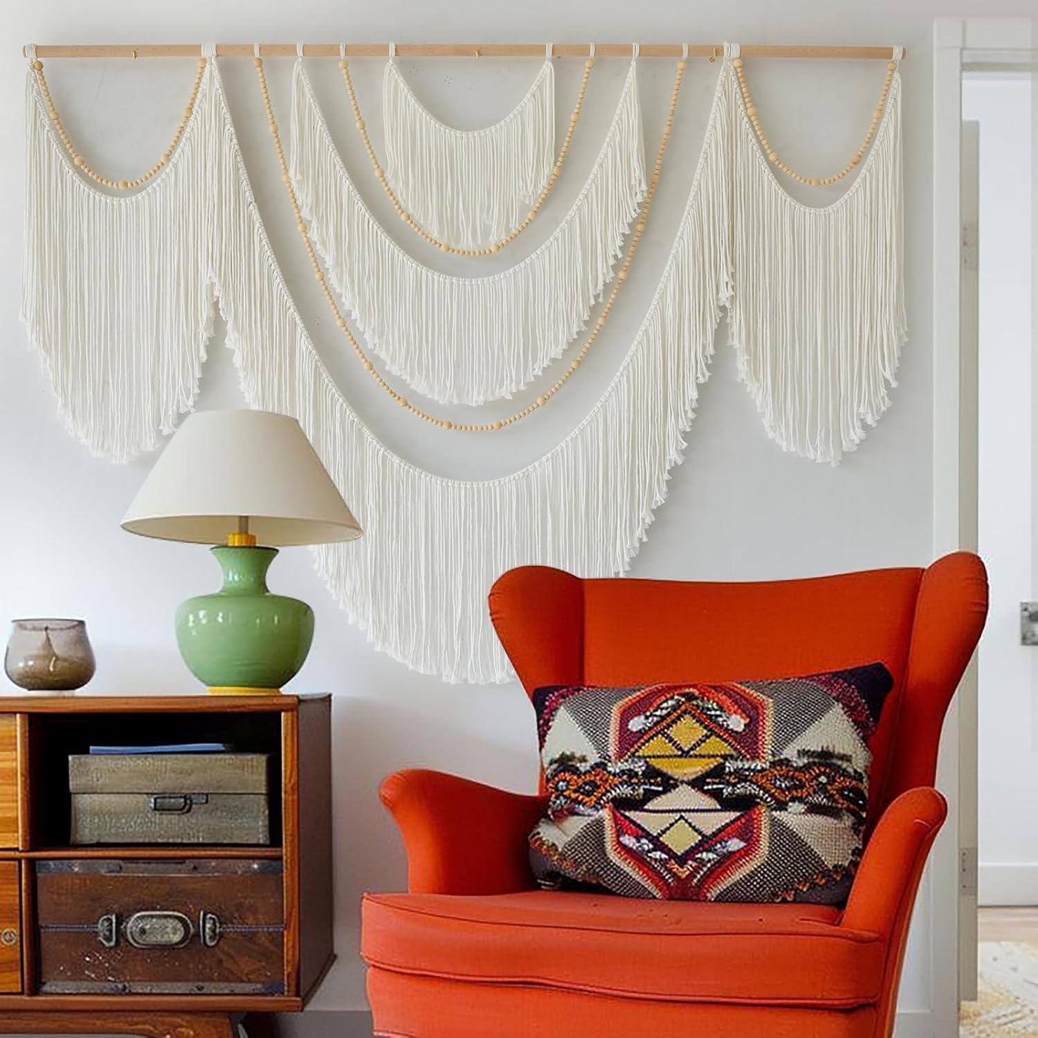 Flber Large Macrame Wall Hanging – Boho Yarn Art Garland with Tassels and Beads, Handmade Rope Decor for Nursery, Party, Wedding, Bedroom, Fireplace Mantel, or Photo Backdrop 57" W x 41" L