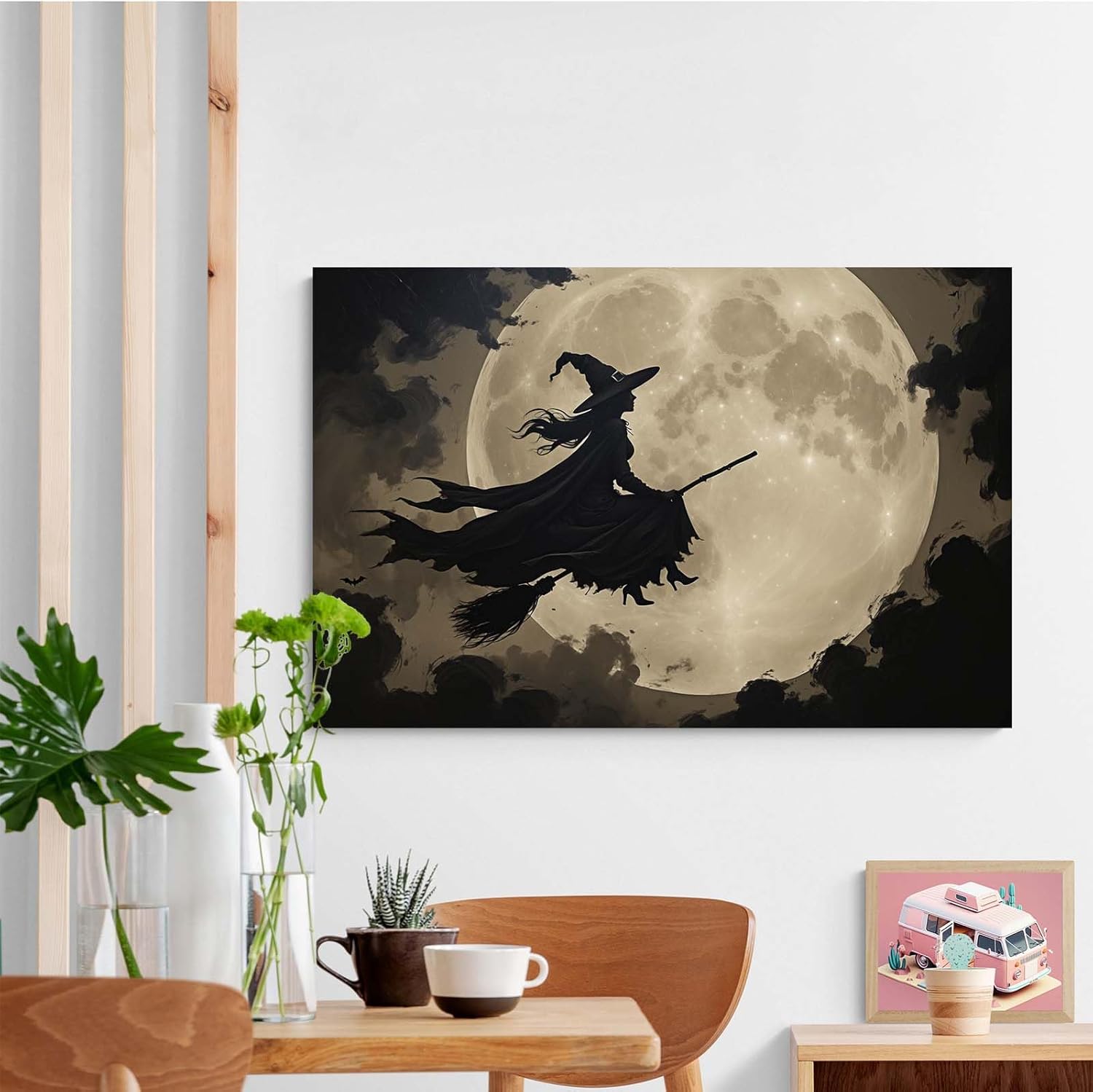 Full moon witch silhouette poster witch on magic broom Halloween mural poster decorative mural art suitable for home living room bedroom12x16in Wood Framed
