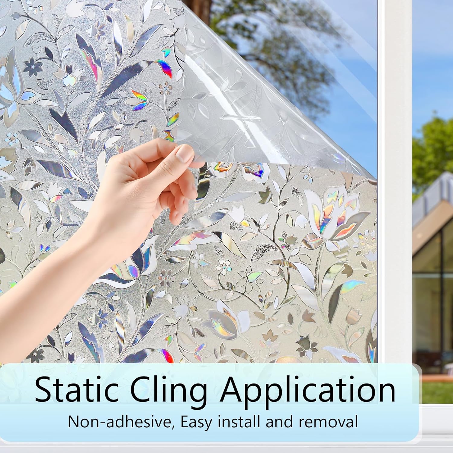 HIDBEA Window Privacy Film, 3D Stained Glass Static Cling - Sun Blocking Anti-UV Heat Control, Reusable Decorative Film for Home/Office Doors, Rainbow Tulip Design (29.5 in x 78.7 in)