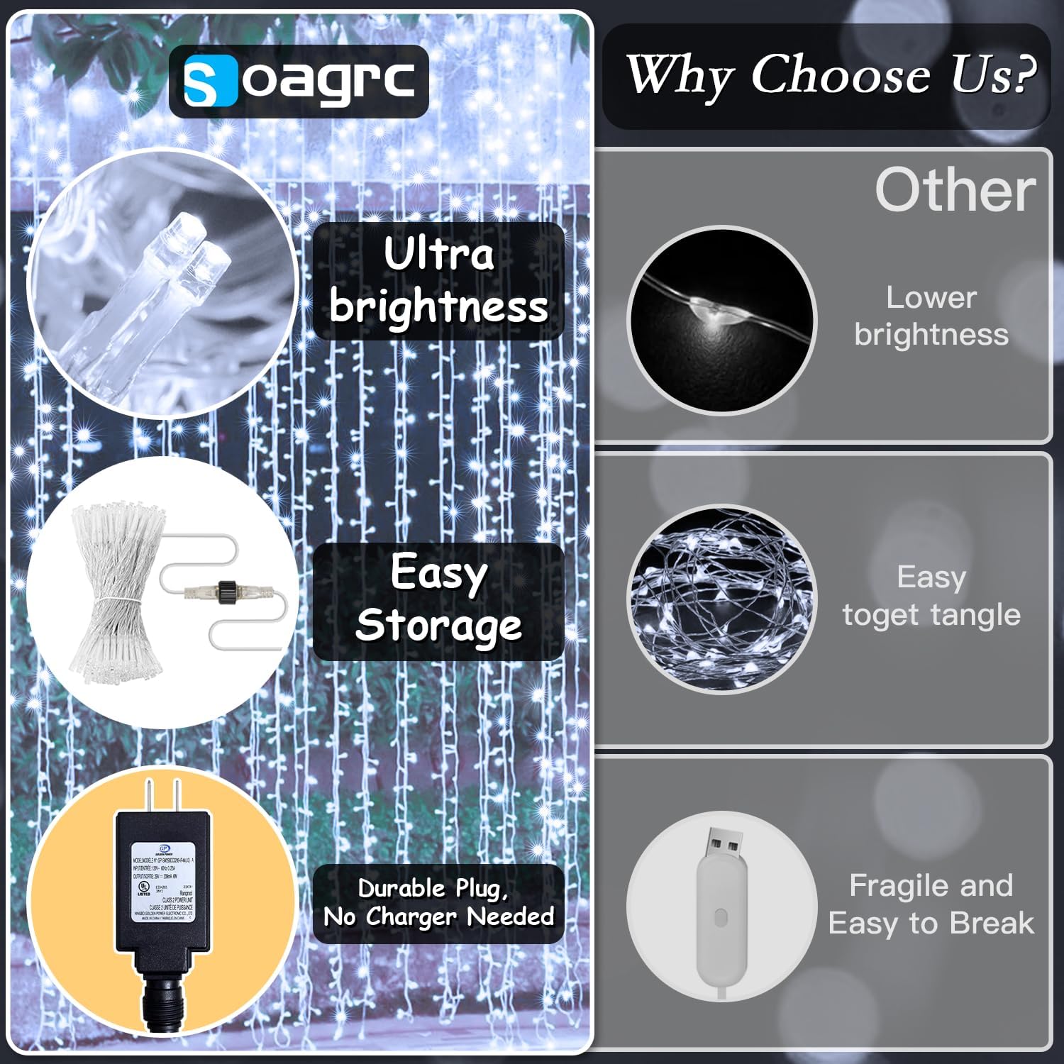 - Upgraded Durability for Everyday Use - Soagrc curtain string lights are crafted with enhanced copper wire and high-quality LEDs to ensure stronger durability. Tangle free and stable, theyβre ideal for everyday use from dressing up your bedroom wall to adding a soft glow behind your reading nook or vanity mirror