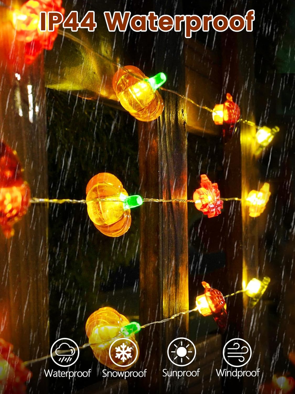 - IP44 Waterproof & safe: These Thanksgiving lights are designed with IP44 waterproof,perfect for any location,ensuring brilliant illumination on rainy days. Crafted from premium silver wire and powered by low-voltage, these Thanksgiving lights won't overheat even after hours of use.Note: the battery case is not waterproof—keep it away from water.
