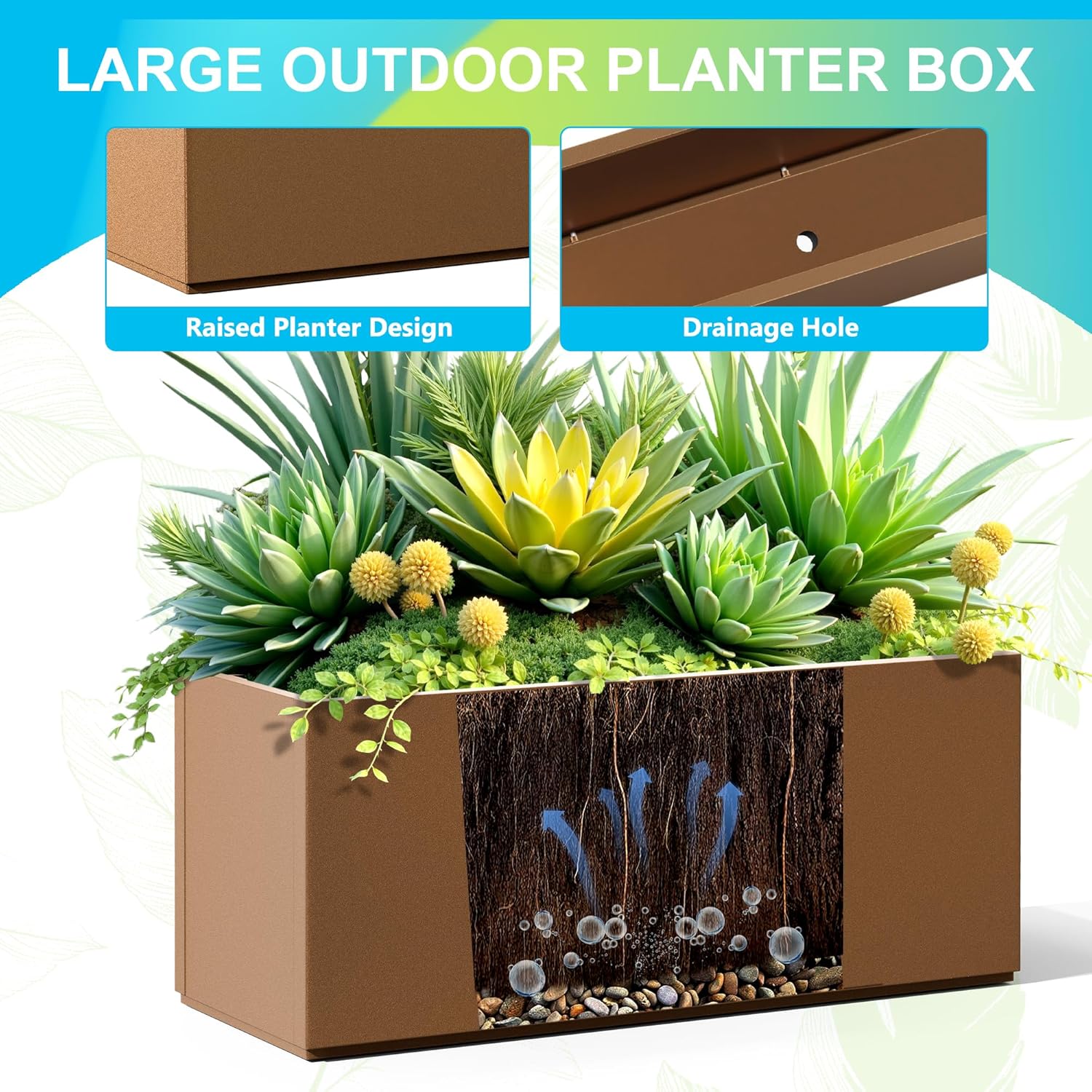 FENCY Large Metal Planter, Large Rectangular Planters for Outdoor Plants, Tall Outdoor Planters for Porch Patio, 38" L x 15" W x 16.3" H Brown Metal Planter with Drainage Hole
