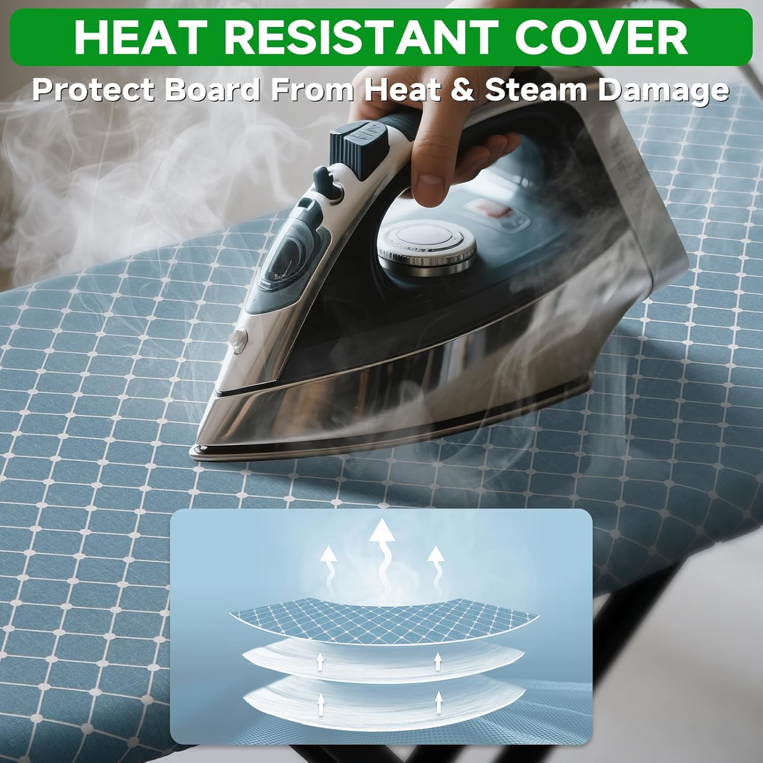 - Heat-Resistant Cover: Features a stylish cross-striped blue cover that is heat and steam resistant, protecting the board from scorching. The breathable metal mesh base enhances steam flow for faster wrinkle removal.