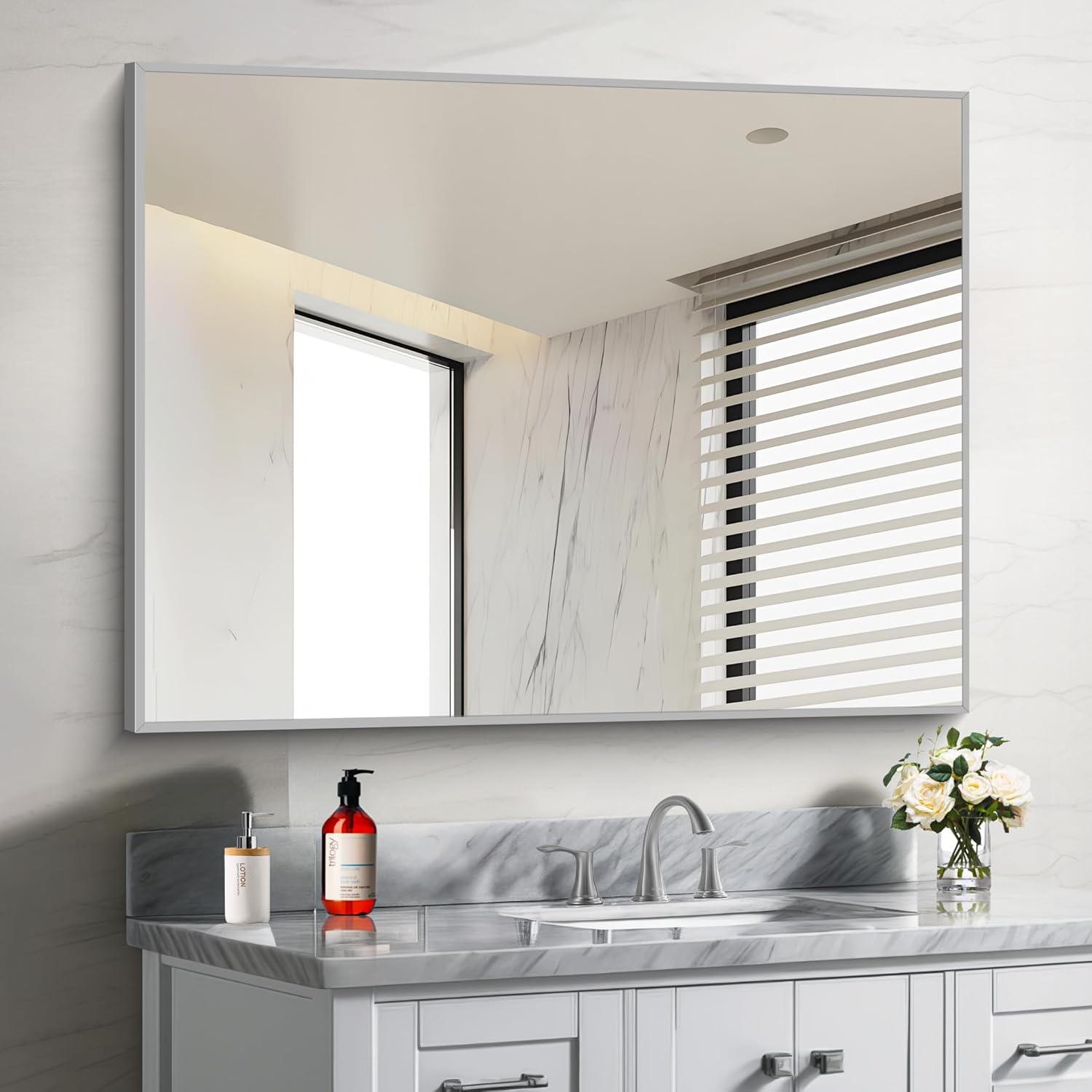 30x40In Silver Bathroom Mirror for Wall, Brushed Nickel Rectangle Mirrors with Metal Frame, Bathroom Rectangular Mirror Modern Wall Mirror for Bedroom Living Room, Hangs Horizontal or Vertical