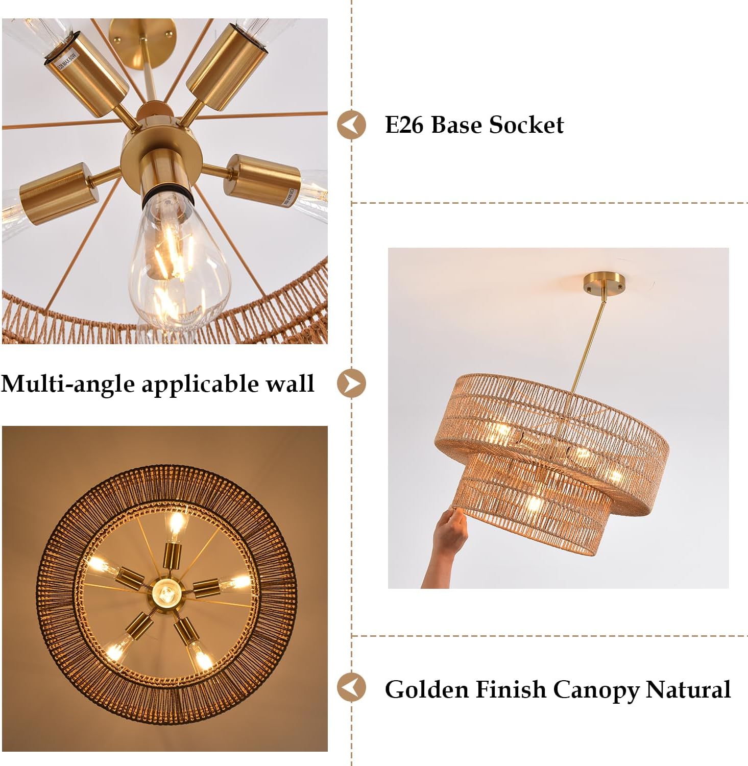 - Boho Chandelier Farmhouse - Boho rattan chandelier is made of natural hand-woven rattan and a sturdy gold metal lamp holder. The light gently filters through the woven rattan, casting beautiful shadows and adding a touch of natural texture to your decor
