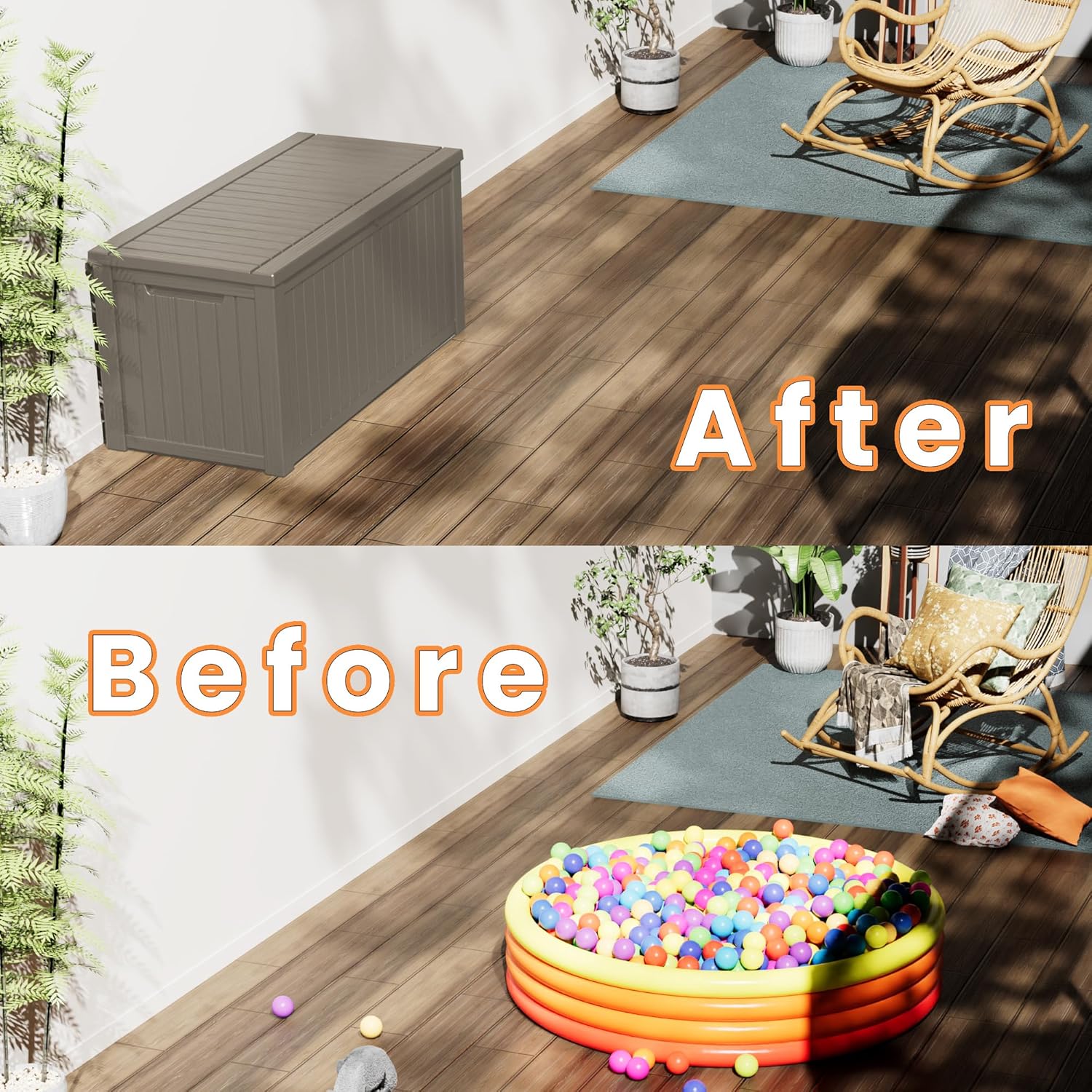 - Both stylish and functional, this patio storage box blends seamlessly with any outdoor decor. Whether your space is modern or classic in style, it will add a sense of sophistication while providing ample storage. Its clean, timeless design enhances the look of your patio, pool area or even indoor space, making it the perfect combination of form and function.