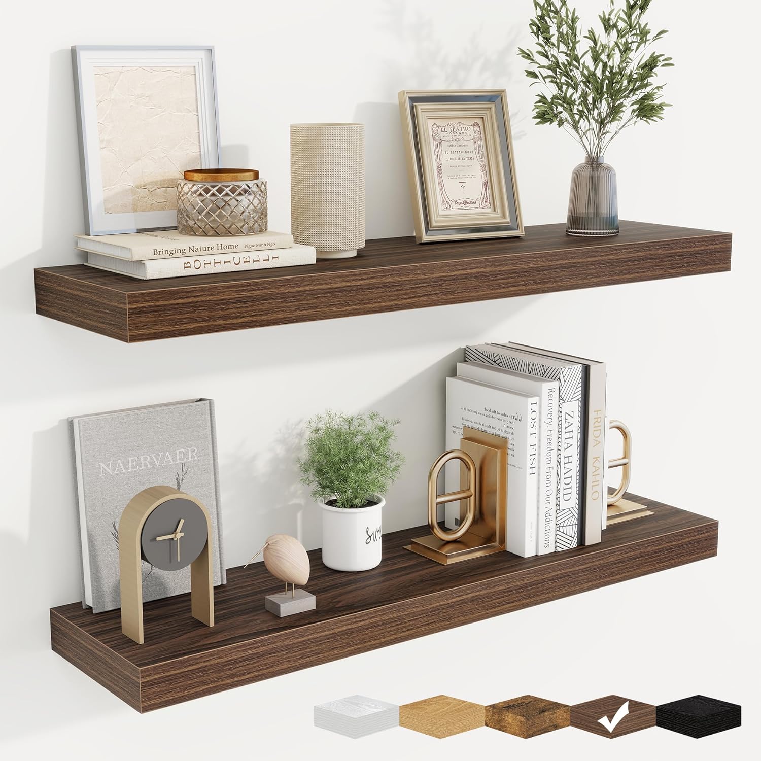 - Well-designed Floating Shelves: Our floating shelves for wall are made of premium engineered wood with a realistic wood grain finish. The rustic wood grain adds warmth and character to any modern or traditional interior. It can organize everyday clutter and make your space tidier, and make it full of aesthetic flare
