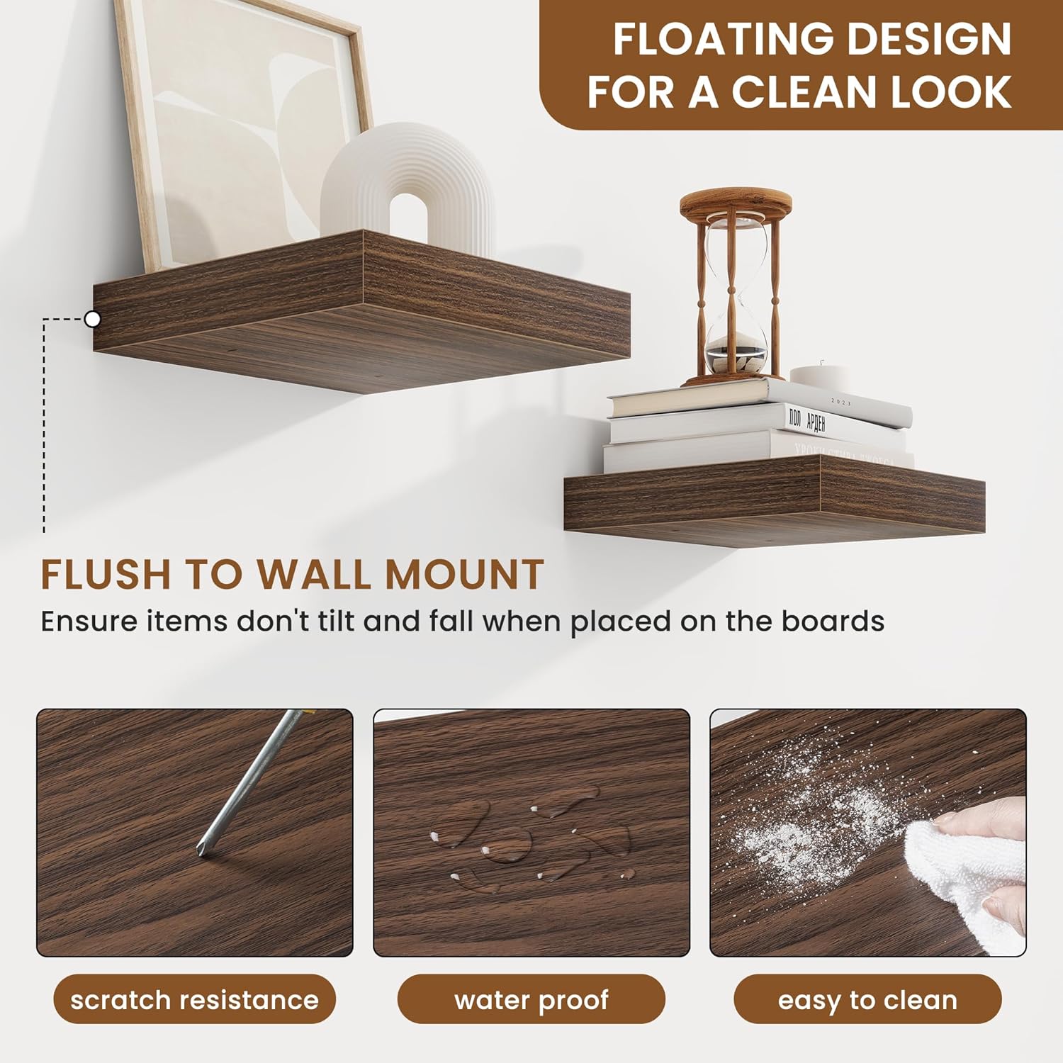- Well-designed Floating Shelves: Our floating shelves for wall are made of premium engineered wood with a realistic wood grain finish. The rustic wood grain adds warmth and character to any modern or traditional interior. It can organize everyday clutter and make your space tidier, and make it full of aesthetic flare