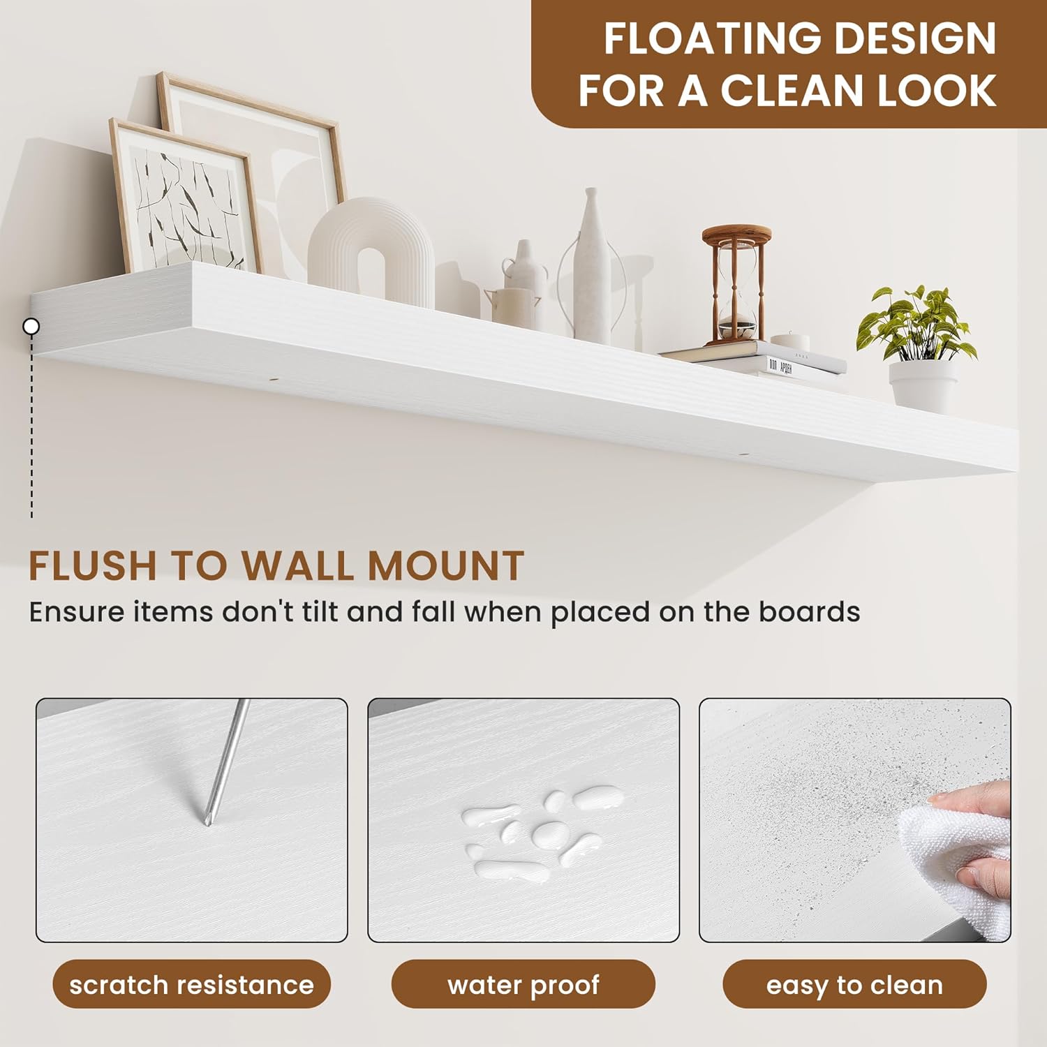 - Well-designed Floating Shelves: Our floating shelves for wall are made of premium engineered wood with a realistic wood grain finish. The rustic wood grain adds warmth and character to any modern or traditional interior. It can organize everyday clutter and make your space tidier, and make it full of aesthetic flare