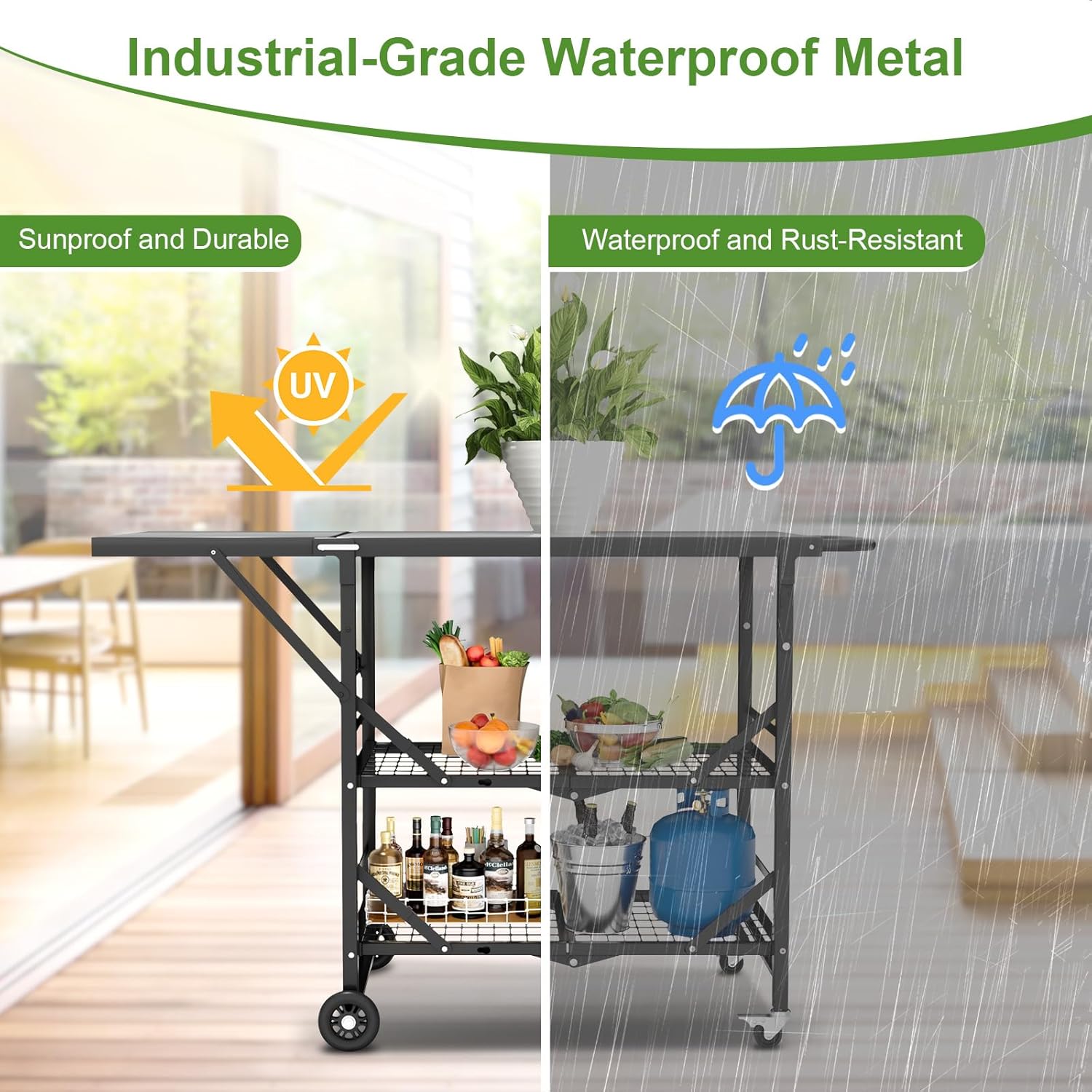 Himix Folding Grill Cart, 3 Tier Outdoor Grill Table with Side, 4 Hooks, Pizza Oven Cooking Prep Table, Portable Outdoor Bar Cart Grill Station