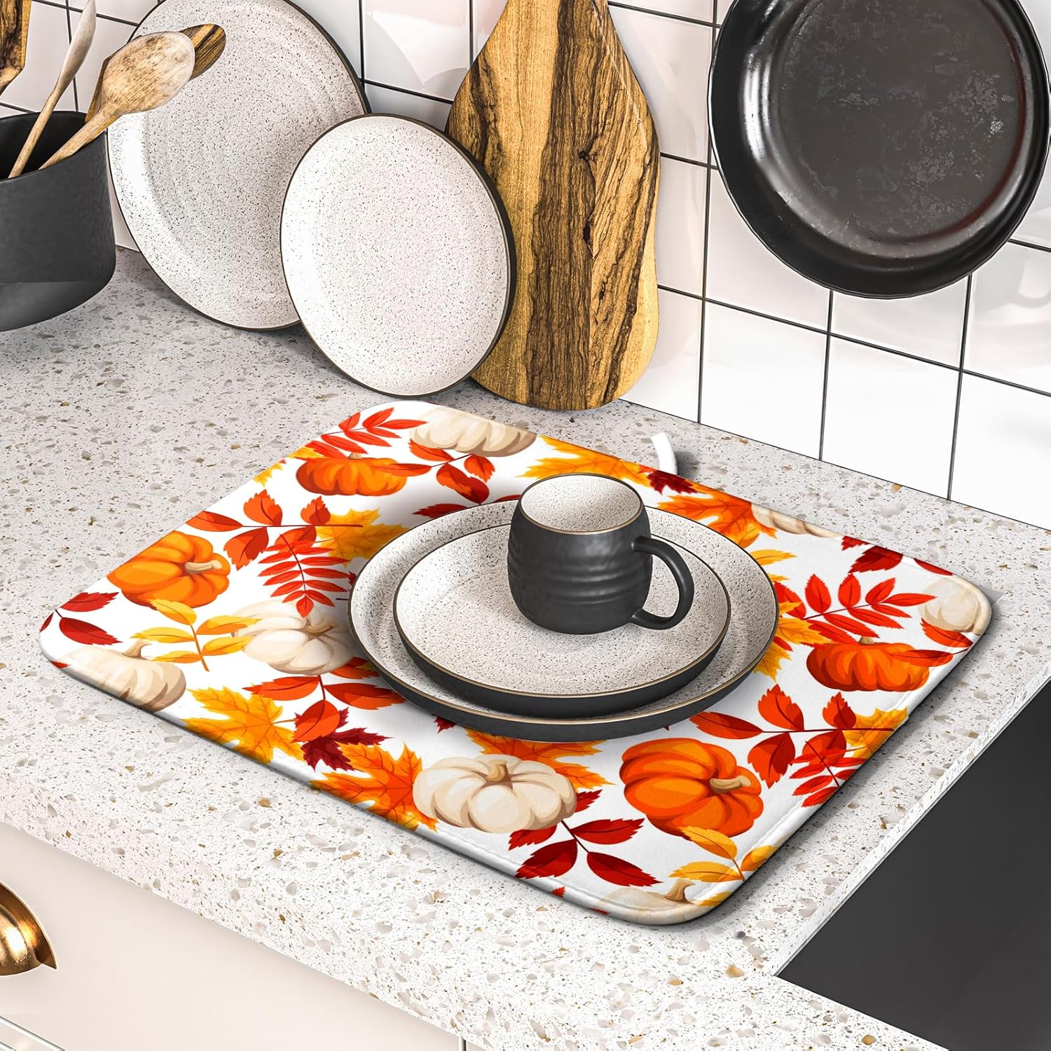 - 【Absorbent】The fall pumpkin dish drying mat is a 3-ply design made of absorbent microfiber, composite sponge, and cotton sateen fabric, the dish drying pad absorbs 4X its weight in water. Perfect for air-drying dishes, glasses, pots, pans, bottles, fruits, and vegetables.