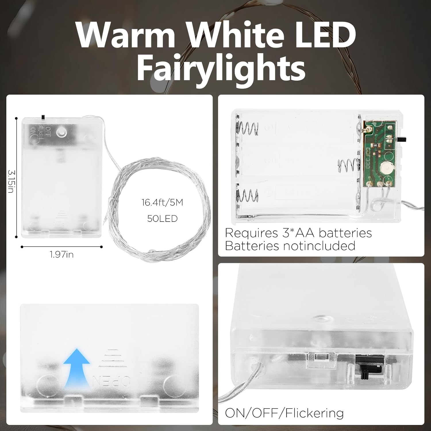 - 4 Pack of Fairy Lights: Fairy Lights Powered by 3 AA batteries (not included), each string of Fairy Lights has 16.4ft 50 energy-efficient Leds. The upgraded design has significantly extended the working hours of Fairy Lights.